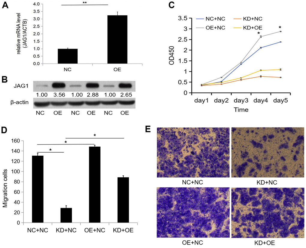 We transfected LV-JAG1 into the Huh-7 cell line to construct a JAG1 functionally overexpressing cell line (OE group). The transfection efficiency was confirmed before the functional experiment. qPCR showed that the expression abundance of the JAG1 gene in the OE group was 3.239 times higher than that in the NC group, and the expression level of the JAG1 gene was significantly increased (p < 0.01, Figure 5A). The WB assay indicated that as compared with the NC group, the expression of JAG1 in the OE group was significantly increased at the protein level (Figure 5B). We then performed cell infection according to the experimental groups, and the experimental results showed that cell transfection was successful.