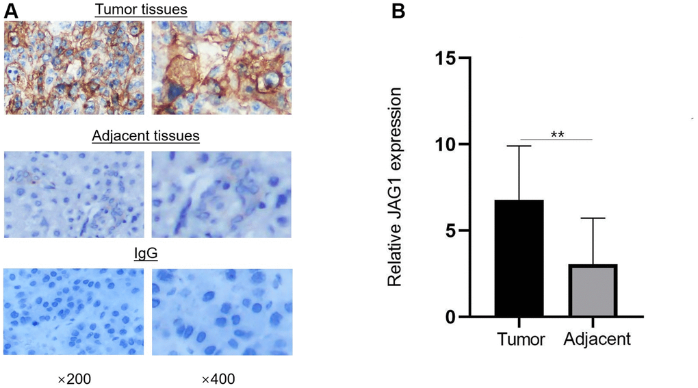 Statistical analysis was conducted with GraphPad Prism 8.0 (GraphPad Prism, La Jolla, CA, USA) and SPSS 25.0 (SPSS, Inc. Chicago, IL, USA). Quantitative data with normal distribution were expressed as mean ± standard deviation (x±s), and comparison between two groups was performed using two independent sample t-test. Quantitative data with skewed distribution were expressed as median (first quartile, third quartile) [M (QL, QU)], and comparison between two groups was performed using the Mann-Whitney U test. The relationship between JAG1 expression and clinicopathological characteristics of patients with HCC was determined using the chi-square test. A p value of < 0.05 was considered to be statistically significant.