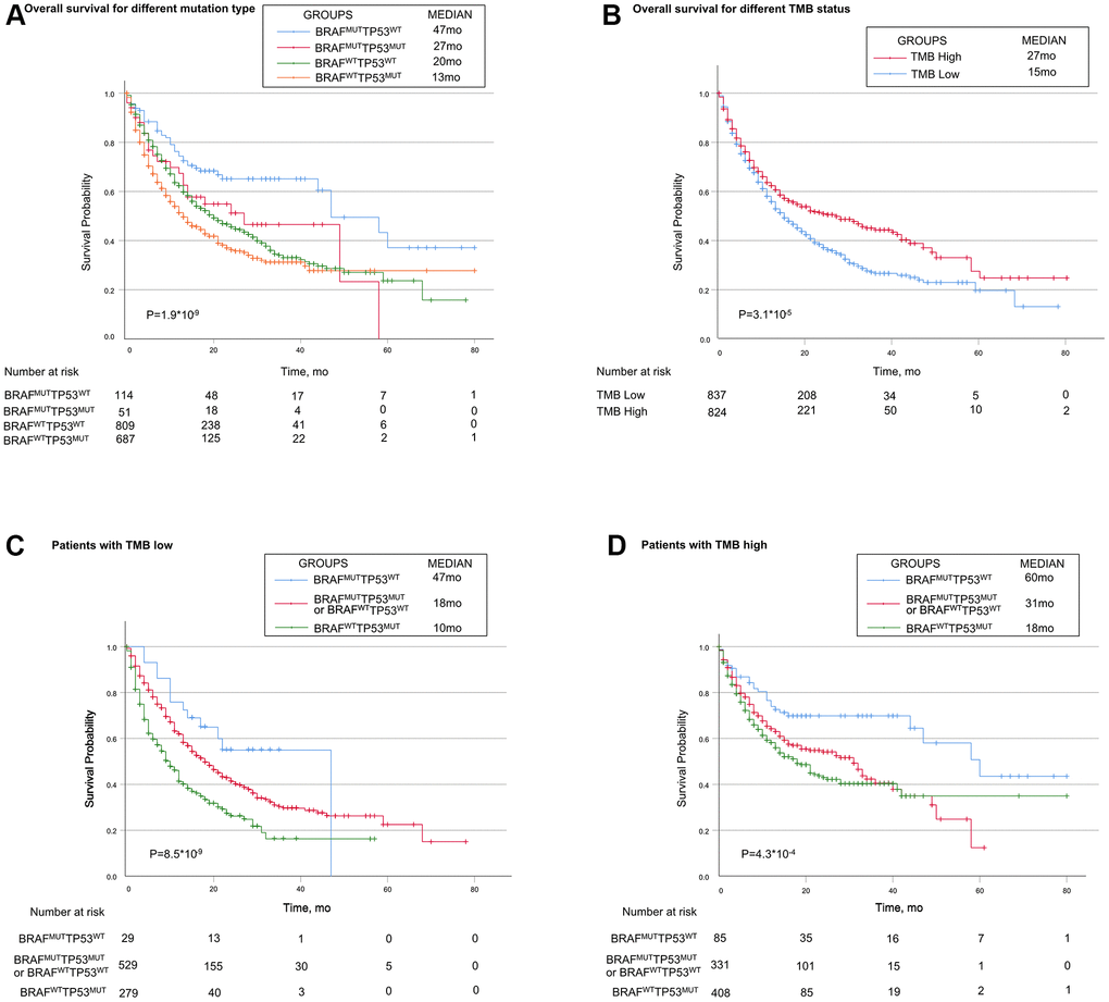 Based on the mutually exclusive relationship between TP53 mutation and BRAF mutation, we explored the immunotherapy response in patients with different combinations of TP53 mutation and BRAF mutation. Patients were divided into four genotypes, patients with BRAF mutation alone (BRAFMUTTP53WT) showed favorable survival (Median, 47 months), while those with TP53 mutation alone (TP53MUTBRAFWT) had the worst survival (Median, 13 months). Patients with both mutations or neither mutation (TP53MUTBRAFMUT or TP53WTBRAFWT) showed moderate survival (Median, 27 months and 20 months, respectively) (Figure 2A).