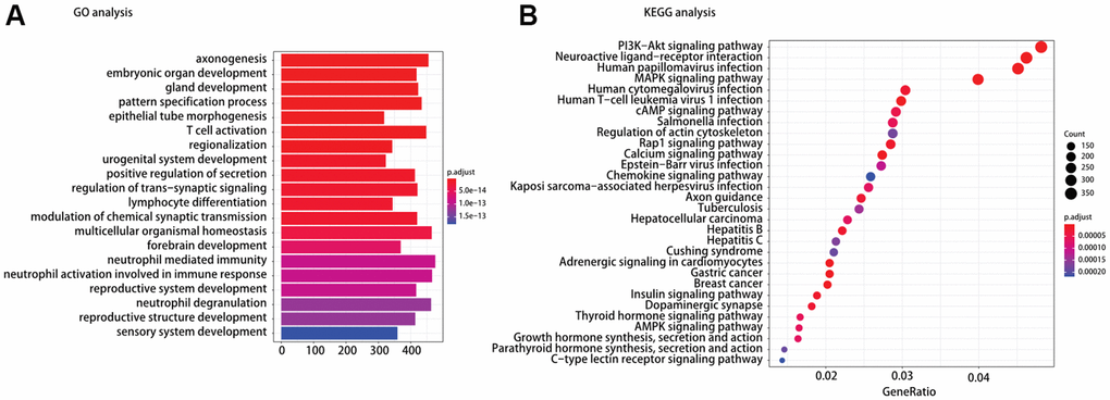 To understand the mechanism of oncogenesis underlying TP53/BRAF mutation correlates with response to ICI, functional enrichment characterization of different expression mRNAs between TP53MUTBRAFWT and BRAFMUTTP53WT was performed by GO and KEGG analysis. According to GO analysis, we found that the enriched GO terms were including T cell activation and lymphocyte differentiation. Moreover, KEGG pathway analysis indicated that most of different expression mRNAs were involved in PI3K−Akt signaling pathway, MAPK signaling pathway, Rap1 signaling pathway, chemokine signaling pathway, and AMPK signaling pathway in cancer (Figure 4).