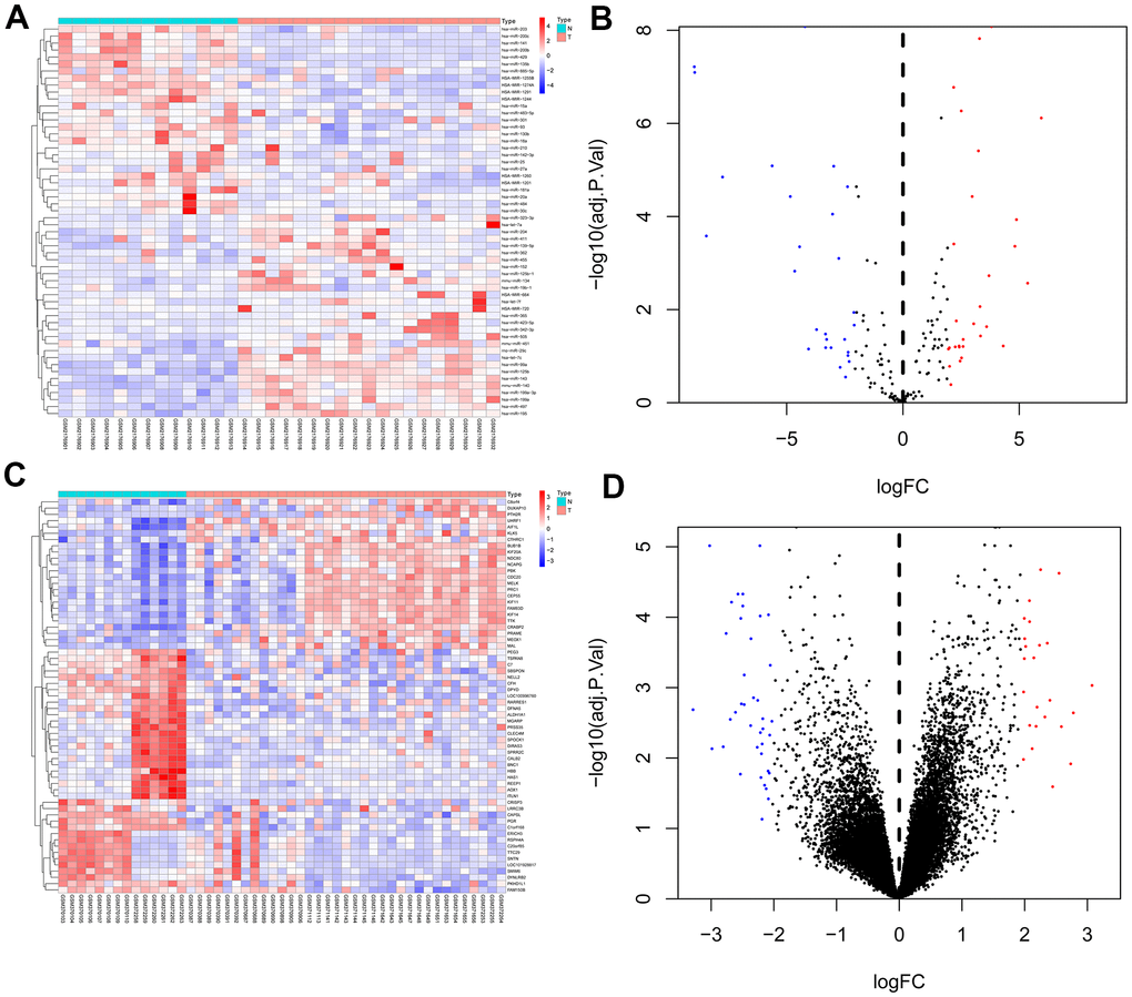 We used GEO2R to analysis the DEMs and DEGs from the GSE81873 and GSE27651. Based on the cut-off criteria, 56 DEMs such as hsa-microRNA-142-3p, hsa-microRNA-429, hsa-microRNA-199a-3p, hsa-microRNA-484, hsa-microRNA-139-5p, hsa-microRNA-483-5p, hsa-microRNA-423-5p, hsa-microRNA-342-3p, hsa-microRNA-885-5p, and 63 DEGs were selected (Figure 1).