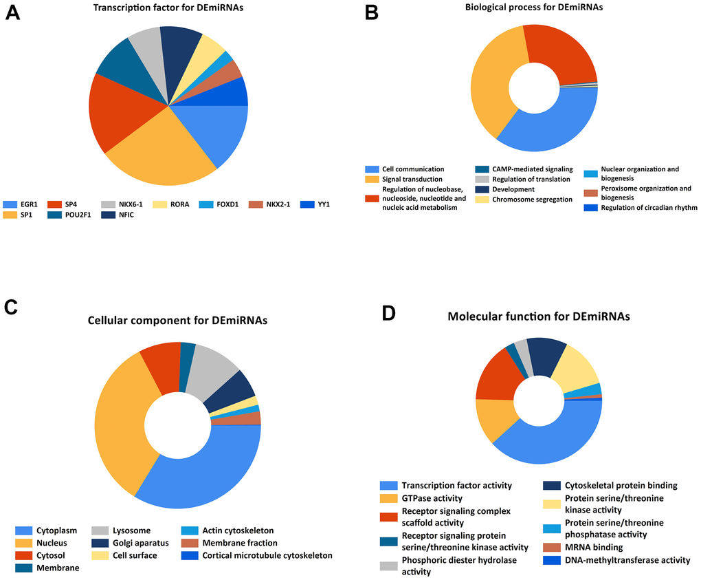 Figure 2. Gene ontology enrichment. (A). Identification of the potential transcription factors of DEMs by FunRich software. (B) biological process, (C) cellular component, and (D) molecular function enrichment analysis of the DEMs.