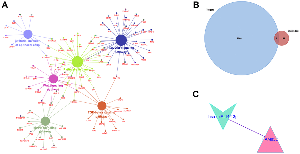 According to FunRich software, 1069 potential target mRNAs were obtained and only 1 of them showed different expression levels in GSE27651 (FAM83D). Based on the association between them, 1 essential microRNA-mRNA pair (microRNA-142-3p and FAM83D) was selected for the next research (Figure 3B, 3C).