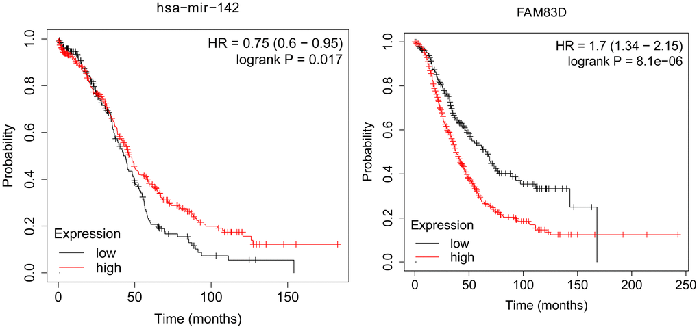 Clinical and gene expression information of OC patients were downloaded in the TCGA database, such as patients’ age, race, FIGO stage, and primary therapy outcome (Tables 1, 2). FAM83D and miR-142-3p expression of patients with Stage III and Stage IV was higher than that of patients with Stage I and Stage II (P<0.05) according to the FIGO stage. Furthermore, associations between clinical characteristics and overall survival in OC were analyzed. According to medium FAM83D and miR-142-3p expression, patients were divided into two groups. Our results indicated that FAM83D mRNA and miR-142-3p expression level (P<0.05), FIGO stage (P<0.05), Primary therapy outcome (P<0.05), and tumor stage (P<0.05) was related to the OS of patients with OC (Tables 3, 4).