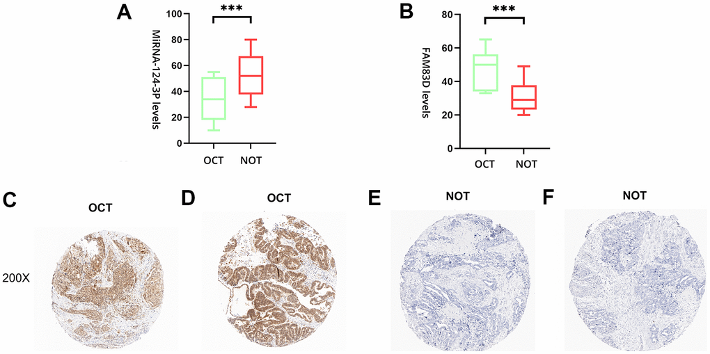 Figure 5. The expression level of hsa-miR-142-3p and FAM83D in normal ovarian tissues (NOTs) and OC tissues (OCTs). (A). Validation of hsa-miR-142-3p ((***, p < 0.001). (B). Validation of FAM83D (***, p < 0.001). (C, D). The expression level of FAM83D in human OCTs. (E, F). The expression level of FAM83D in human NOTs (scale bar: 200×).