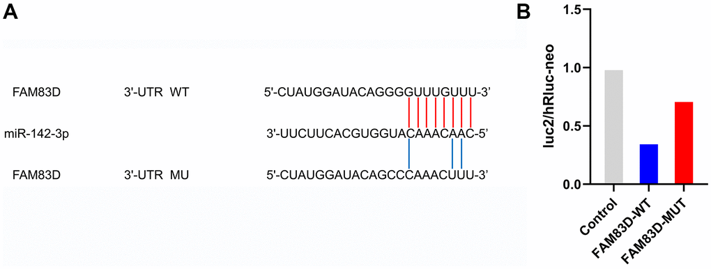 Figure 6. FAM83D is a direct target of miR-142-3p in OC cells. (A) Putative binding sites in FAM83D 3’UTR for miR-142-3p were predicted by bioinformatics analysis (microRNA.org). (B). Validation of luc2/hRluc-neo between miR-142-3p and FAM83D.