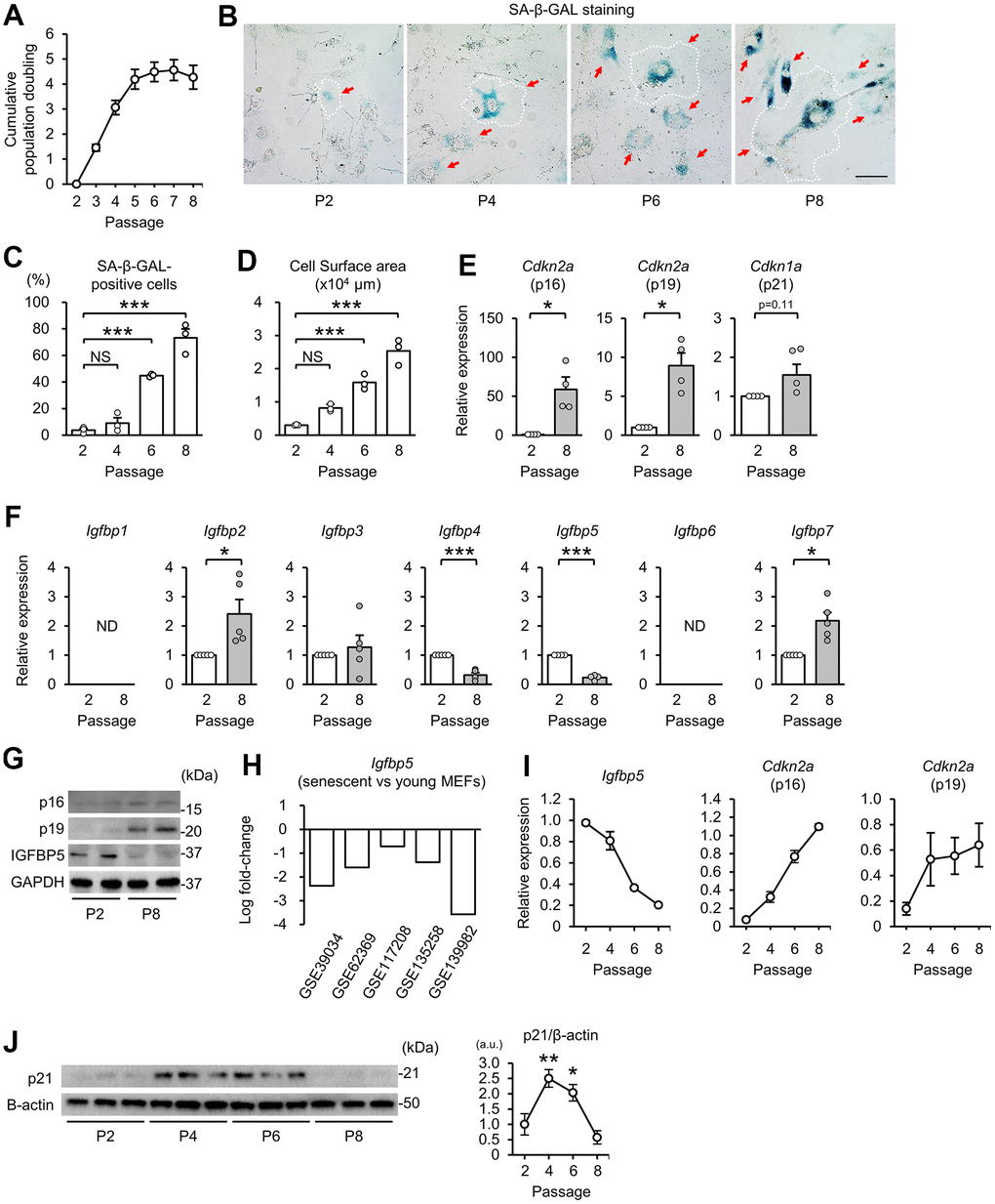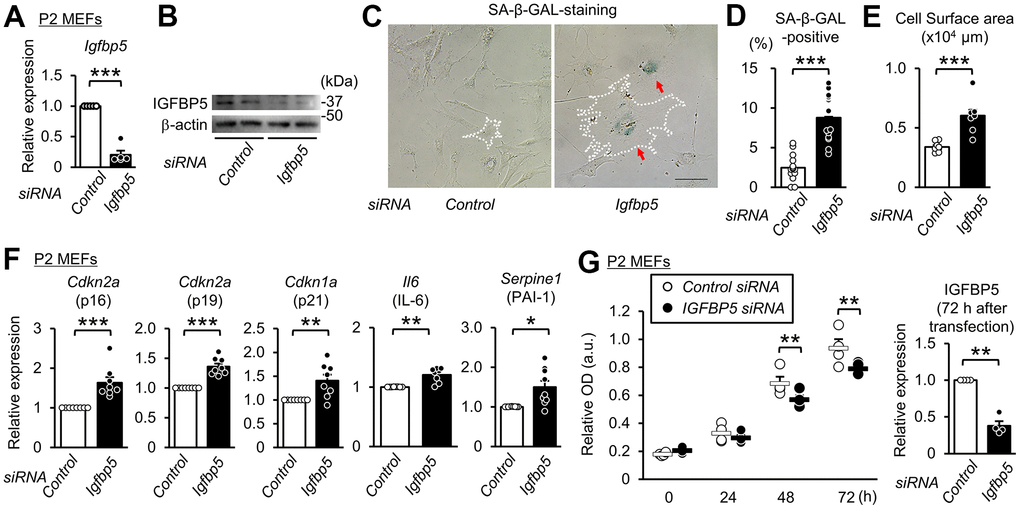 Knockdown of IGFBP5 induces premature senescence in P2 MEFs