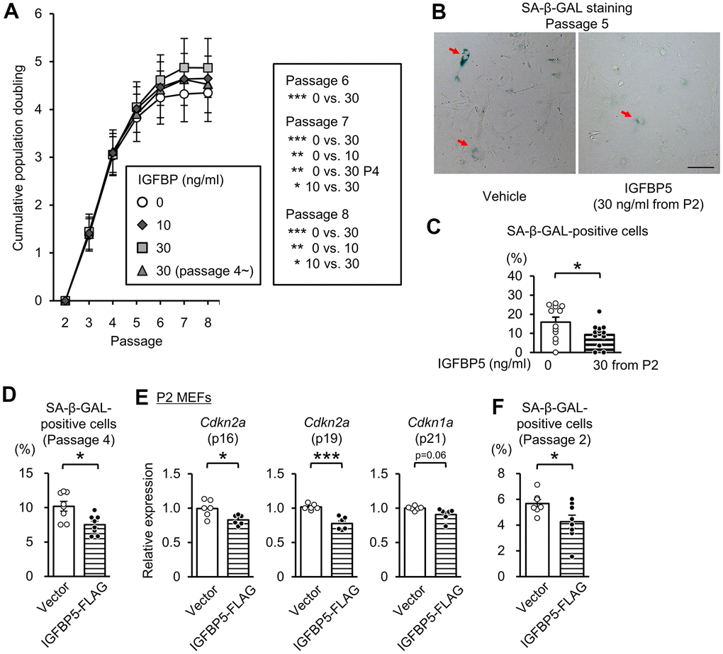 To determine the role of extracellular IGFBP5, we next investigated the effects of exogenous supplementation of IGFBP5 on replicative senescence. IGFBP5-FLAG was purified from a medium of COS7 cells expressing IGFBP5-FLAG. The medium from COS7 cells expressing IGFBP5-FLAG inhibited IGF-1-induced Akt phosphorylation (Supplementary Figure 3). We incubated MEFs with a vehicle and with 10 ng/ml and 30 ng/ml IGFBP5 starting from P2. MEFs were also incubated with 30 ng/ml IGFBP5 starting from P4. Incubation with IGFBP5 at 30 ng/ml from P2 increased the cumulative population doubling levels at P6, P7, and P8 compared with those in vehicle-treated control cells (Figure 3A). Incubation with 10 ng/ml IGFBP5 from P2 and 30 ng/ml IGFBP5 from P4 also increased the cumulative population doubling, but the effects were less than that of 30 ng/ml IGFBP5 from P2 (Figure 3A). The percentage of cells positive for SA-β-GAL at P5 was decreased by treatment with 30 ng/ml IGFBP5 from P2 (Figure 3B, 3C). These findings suggest that extracellularly supplemented IGFBP5 plays a role in suppression of replicative senescence. Levels of Cdkn2a (p16 and p19) in P6 MEFs tended to be reduced by incubation with 30 ng/ml IGFBP5 from P2, but the difference did not reach statistical significance. Cdkn1a (p21) mRNA was not decreased by exogenous IGFBP5 at P6 (Supplementary Figure 4). The expression levels were not changed by incubation with either IGFBP5 at 10 ng/ml from P2 or 30 ng/ml from P4.