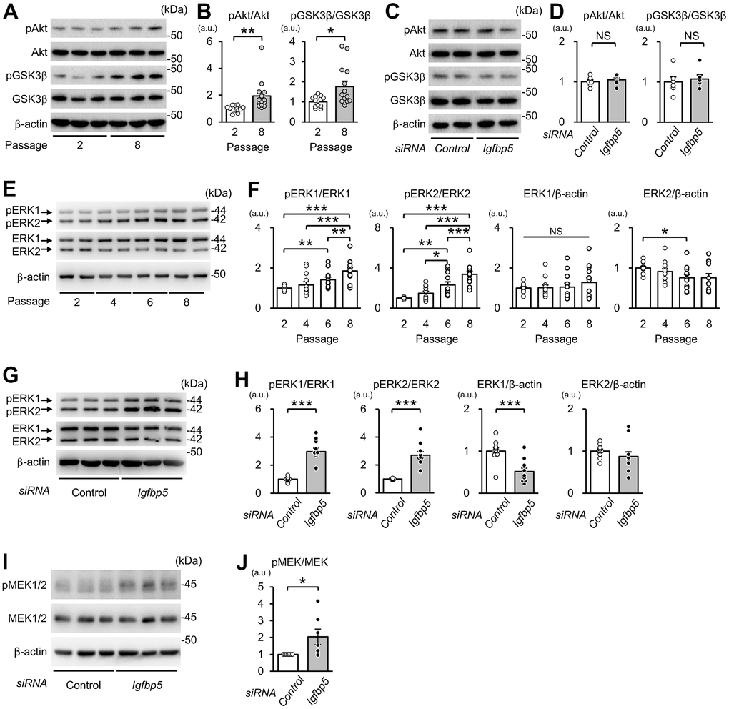Western blotting was performed as previously reported [61, 62]. The antibodies used were rabbit polyclonal anti-phospho-Ser473-Akt (#9271, 1:1000, Cell Signaling Technology, Danvers MA, USA), rabbit monoclonal anti-Akt (#4691, 1:1000, Cell Signaling Technology), rabbit polyclonal phospho-Ser9-GSK3β (#9336, 1:1000, Cell Signaling Technology), rabbit monoclonal GSK3β (#9315, 1:1000, Cell Signaling Technology), rabbit polyclonal anti-phospho-Thr202/Tyr204-ERK1/2 (#9101, 1:1000, Cell Signaling Technology), rabbit polyclonal anti-ERK1/2 (#9102, 1:1000, Cell Signaling Technology), rabbit polyclonal anti-phospho-Ser217/221-MEK1/2 (#9121, Cell Signaling Technology), rabbit polyclonal anti-MEK1/2 (#9122, Cell Signaling Technology), rabbit polyclonal anti-p16 (10883-1-AP, 1:500, Proteintech, Rosemont, IL, USA), rat monoclonal anti-p19 (sc-32748, 1:200, Santa Cruz Biotechnology, Santa Cruz, CA, USA), rabbit polyclonal anti-p21 (ab7960, Abcam, Cambridge, UK), goat polyclonal anti-IGFBP5 (sc-6006, 1:200, Santa Cruz Biotechnology), mouse monoclonal anti-FLAG (F3165, 1:1000, Sigma Aldrich; Merck KGaA, Darmstadt, Germany), mouse monoclonal anti-β-actin (010-27841, 1:10000, Fujifilm Wako Pure Chemical Corporation, Osaka, Japan), and mouse monoclonal anti-GAPDH (G8795, 1:10000, Sigma Aldrich, St. Louis, MO, USA).