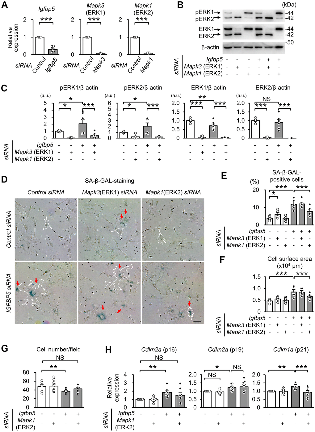 To examine whether activated ERK1 and ERK2 by IGFBP5 knockdown are involved in the induction of senescent phenotypes, we examined effects of knockdown of ERK1 and ERK2 using a combination with IGFBP5 siRNA in P2 MEFs. Cells were analyzed 48 h after ERK1 or ERK2 siRNA transfection. The RT-qPCR and Western blot analyses confirmed knockdown of ERK1 or ERK2 (Figure 5A–5C). Knockdown of ERK1 alone caused an increase in the level of phospho-ERK2, while knockdown of ERK2 elevated the level of phospho-ERK1 (Supplementary Figure 6). ERK1 knockdown alone increased the number of SA-β-GAL-positive cells. However, increases in SA-β-GAL-positive cells and cell surface area induced by IGFBP5 knockdown were not affected by ERK1 knockdown (Figure 5D, 5E). On the other hand, the increase in SA-β-GAL-positive cells and enlargement of the cell surface area by IGFBP5 knockdown were inhibited by ERK2 knockdown (Figure 5D, 5E). The reduction in the cell number in IGFBP5-knockdown cells was canceled by ERK2 knockdown (Figure 5G). Cdkn2a (p16) mRNA level was significantly increased by IGFBP5 knockdown, which was also cancelled by ERK2 knockdown (Figure 5H). ERK2 knockdown did not affect Cdkn2a (p19) mRNA level (Figure 5H). Cdkn1a (p21) mRNA level in IGFBP5-knockdown cells was reduced by ERK2 knockdown (Figure 5H).