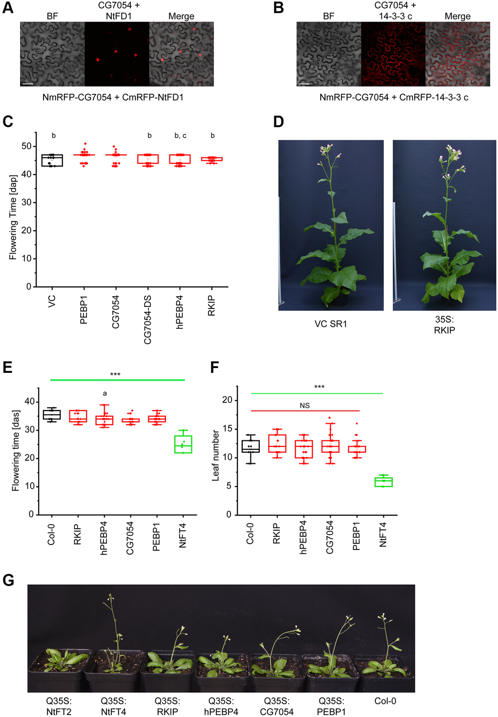 The regulation of flowering time by FT-like proteins requires the binding of 14-3-3 scaffolding proteins to recruit specific bZIP transcription factors such as NtFD1 [18, 27]. We found that Drosophila CG7054 (which has the highest similarity to tobacco PEBPs) is also able to interact with tobacco 14-3-3 proteins and the transcription factor NtFD1 in Nicotiana benthamiana leaves, as revealed by bimolecular fluorescence complementation (BiFC) (Figure 1A, 1B). But despite these canonical interactions, the ubiquitous expression of CG7054 or other Drosophila or human PEBPs – PEBP1, a chimeric CG7054 carrying segments of NtFT4 (CG7054-DS, Supplementary Figure 2), RKIP and hPEBP4 – in Arabidopsis and tobacco had a negligible impact on flowering time (Figure 1C–1G).