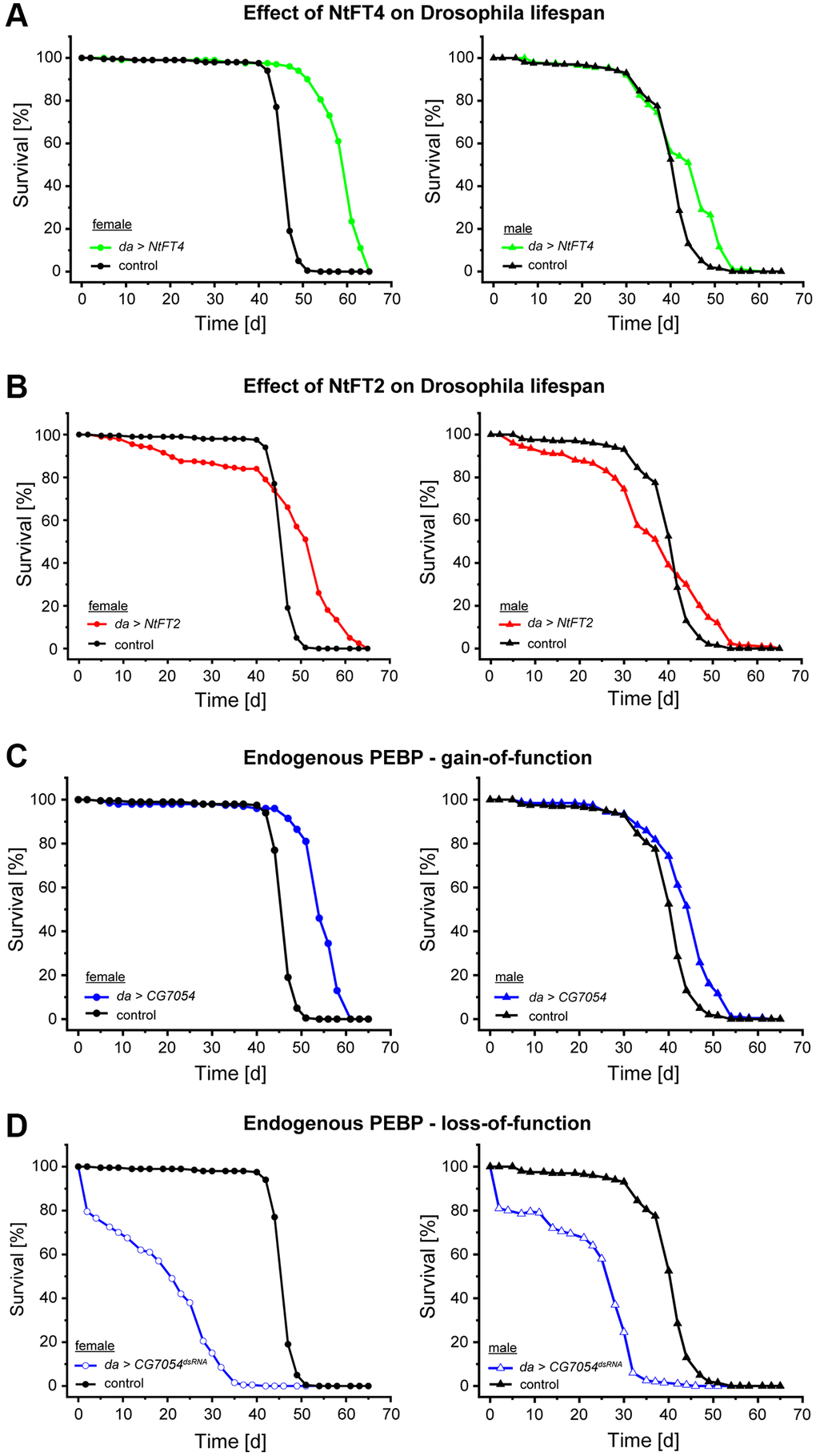 Table 1. Survival of female flies with dysregulated PEBP expression ([da-Gal4/UAS-CG7054, da-Gal4/UAS-NtFT2 or da-Gal4/UAS-NtFT4] or [da-Gal4/UASt-CG7054dsRNA]) compared to +/da-Gal4 controls.