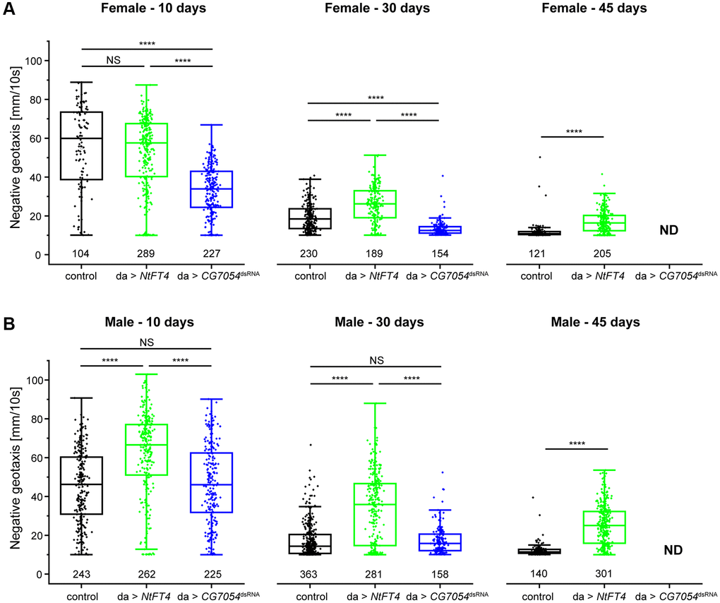 Old flies expressing CG7054 or NtFT4 showed higher rates of motility than similarly-aged control flies. To quantify locomotion of adult flies we employed the rapid iterative negative geotaxis (RING) assay to characterize age-related decline in the locomotor ability of flies climbing the side of a tube [30]. Control female flies always show greater motility than age-matched males, so we tested the two sexes separately. We compared flies expressing NtFT4 (long-lived) or CG7054dsRNA (short-lived) to controls at different ages (10, 30 and 45 days) although the short lifespan of the CG7054dsRNA flies prevented the tests of this genotype at 45 days (Figure 3). Female CG7054dsRNA flies showed a consistent locomotor decline compared to controls and NtFT4 flies regardless of age (−40.25% and −38.86% at 10 days old, −30.16% and −47.50% at 30 days old, compared to control and NtFT4 flies, respectively; Figure 3A). Interestingly, CG7054dsRNA expression did not affect the locomotor activity of male flies, regardless of their age (Figure 3B). In contrast, the NtFT4 expression increased locomotor activity in male flies of all ages compared to controls (+36.09% at 10 days old, +97.37% at 30 days old, +105.68% at 45 days old; Figure 3B). In addition, male da > NtFT4 flies were even more active at 45 days old than the control flies at 30 days old based on the velocity of negative geotaxis (NtFT4♂ 45 days = 2.54 mm/s, control♂ 30 days = 1.71 mm/s, p = 7.32 × 10−9). In young female flies, NtFT4 expression had no effect on locomotor activity, but it increased the locomotor activity of old females (+33.02% at 30 days old, +43.35% at 45 days old, compared to controls; Figure 3A). At this stage, old da > NtFT4 females showed locomotion comparable to control flies 15 days younger (NtFT4♀ 45 days = 1.71 mm/s, control♀ 30 days = 1.92 mm/s, p = 0.64).