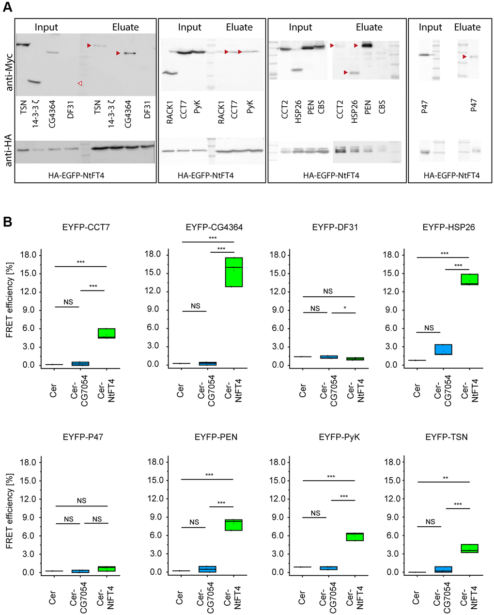 To refine the list of interaction partners in a Drosophila cell model, we performed immunoprecipitation experiments using transiently transfected S2 cells expressing NtFT4 tagged with HA-EGFP (at the C-terminus or N-terminus) and used HA-EGFP as a reference. We were unable to detect HA-tagged NtFT4 in extracts of the transgenic flies, thus preventing in vivo interaction assays. The precipitates generated using HA-EGFP and HA-EGFP-NtFT4 (Supplementary Figure 7) were analyzed by LC-MS/MS. This revealed 23 putative NtFT4 interaction partners (Supplementary Table 2). Following the cell model, we confirmed the interactions between NtFT4 and CCT7, CG4364, HSP26, PEN, PyK and TSN by co-immunoprecipitation (Figure 4A) and fluorescence resonance energy transfer (FRET) analysis (Figure 4B). The gating strategy to quantify FRET efficiency in all experiments is shown in Supplementary Figure 8. Although we detected a FRET signal when CG7054 was combined with HSP26, PEN and TSN, these interactions were inconclusive and significantly weaker than the corresponding assays with NtFT4. EYFP-HSP26 achieved the following FRET efficiencies: CER-NtFT4 = 13.8%, CER-CG7054 = 2.3% and CER = 0.78%. When testing EYFP-PEN, the equivalent results were CER-NtFT4 = 7.9%, CER-CG7054 = 0.5% and CER = 0.2%. Finally with EYFP-TSN, the results were CER-NtFT4 = 3.8%, CER-CG7054 = 0.4% and CER = 0.0% (Figure 4B). There was no overlap between the interactions detected in the in vivo Y2H assay and those based on protein complexes extracted from Drosophila S2 cells.
