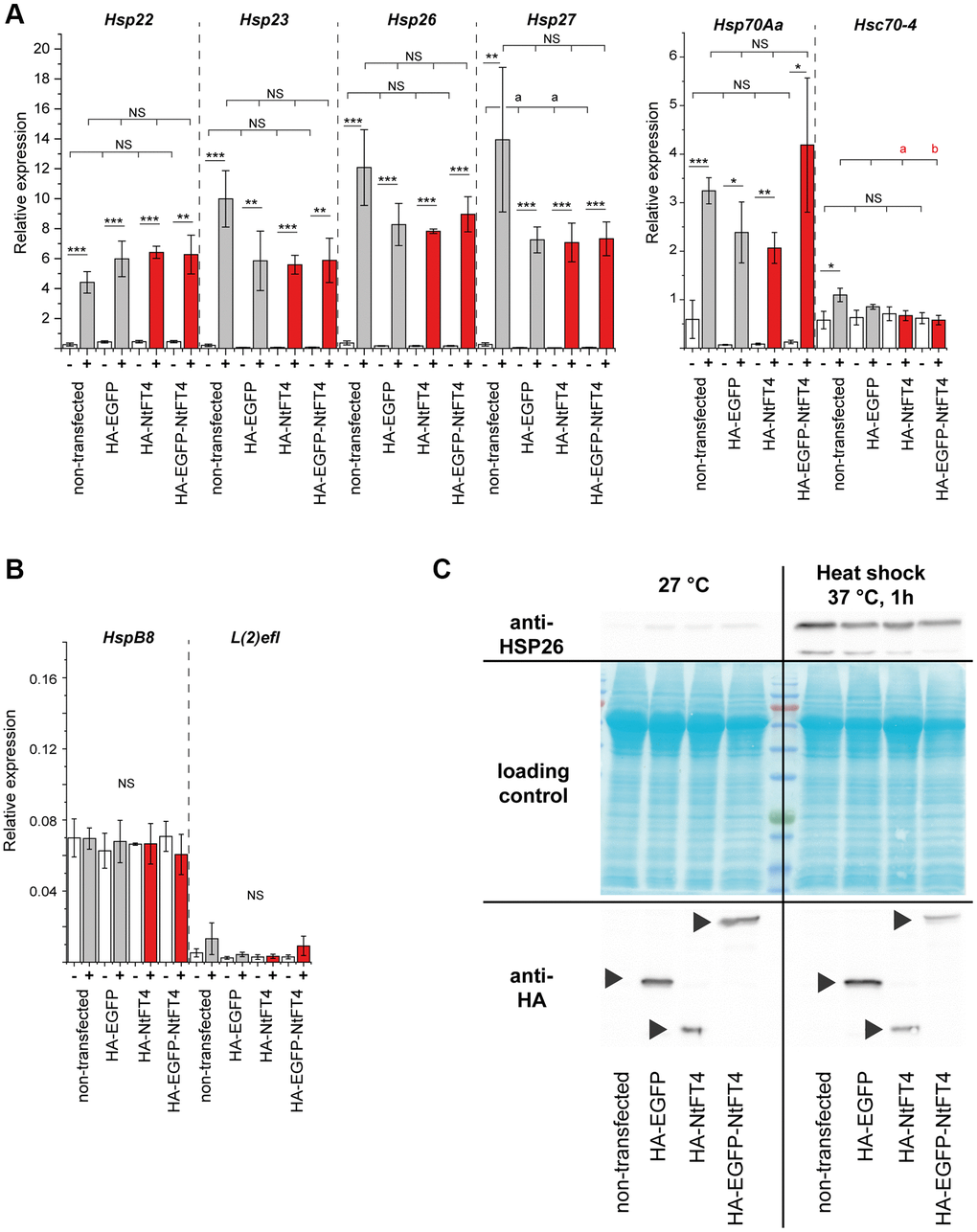 Heat shock proteins are often induced by stress, particularly heat stress. We observed no significant upregulation of any heat shock gene following transfection with NtFT4 or any other construct (Figure 5A, 5B). However, we detected significant increases in the expression of Hsp22, Hsp23, Hsp26, Hsp27 and Hsp70Aa under heat stress, regardless of transfection. We also confirmed the accumulation of HSP26 protein in response to heat stress but not transfection (Figure 5C). Neither transfection nor heat shock affected the expression of HspB8, l(2)efl or Hsc70–4. These data suggest that NtFT4 expression per se does not elicit a stress response.