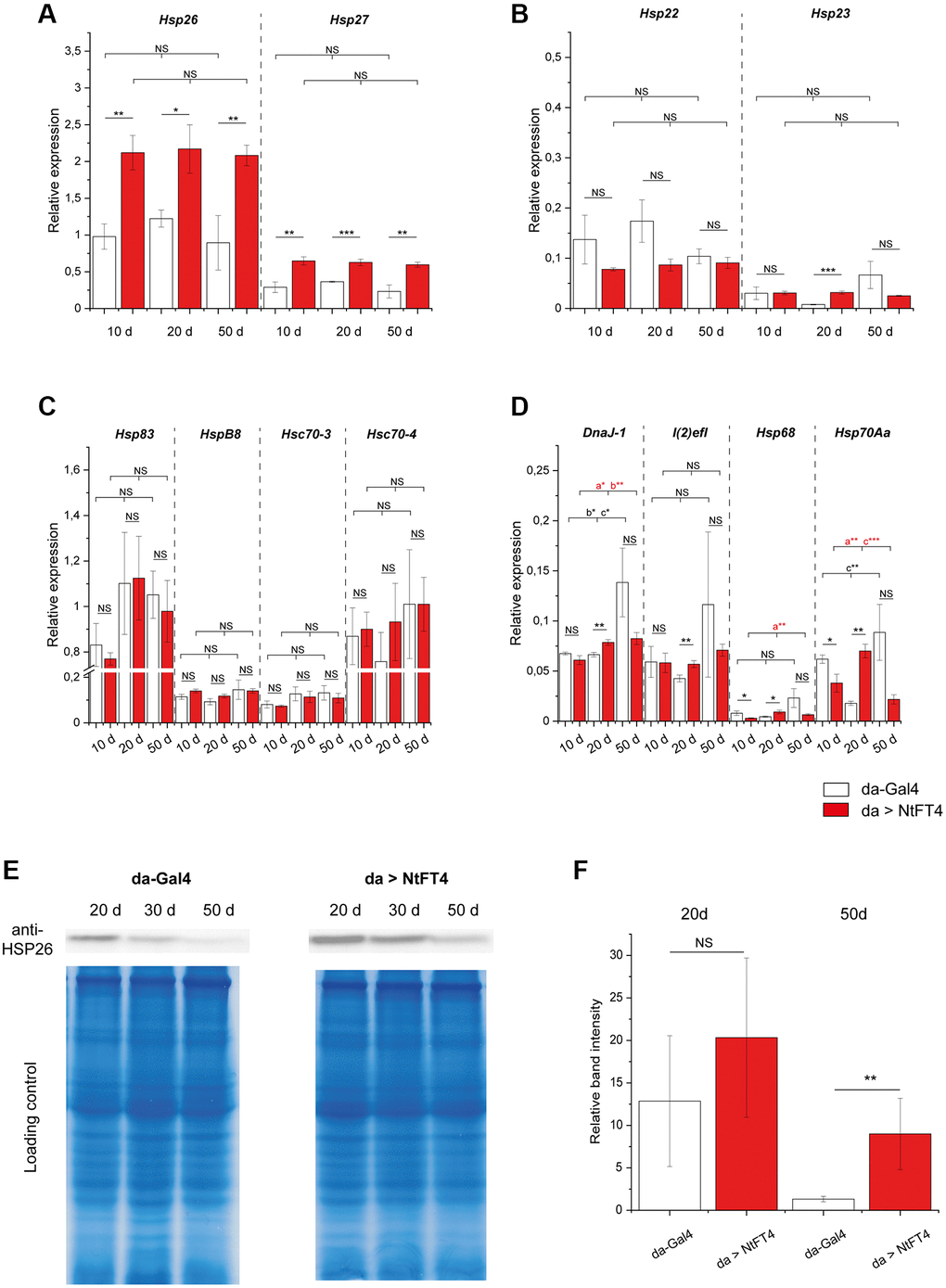 The expression of Hsp26 and Hsp27 decreases as flies age [35]. Accordingly, we quantified the expression of different heat shock family members at different ages in flies, revealing that NtFT4 significantly enhances the expression of Hsp26 and Hsp27, which encode the most abundant members of the small heat shock protein family (Figure 6A–6D). In contrast, NtFT4 did not affect the expression of Hsp83 and Hsc70–4, which encode the most abundant larger heat shock proteins (Figure 6C). No consistent correlation between NtFT4 and the expression of genes encoding other small (Hsp22 and Hsp23) or larger (HspB8, Hsc70–3, DnaJ-1, l(2)efl, Hsp68 and Hsp70Aa) heat shock proteins was observed, emphasizing the specific link between NtFT4 and Hsp26 and Hsp27. The expression of Hsp26 was mirrored by the abundance of HSP26 protein, which decreased stepwise in control flies aged 20+ days, eventually becoming barely detectable after 50 days (Figure 6E, 6F). The abundance of HSP26 also decreased with age in flies expressing NtFT4, but the rate of decline was shallower and the protein was still detectable in flies aged 50 d, comparable to the levels at 30 d in control flies (Figure 6E).