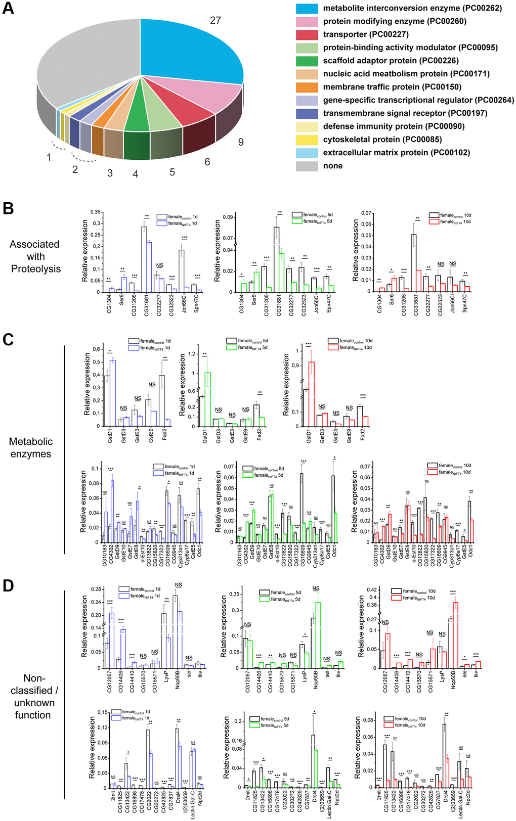 RNA was extracted from female flies (da > NtFT4 and da-Gal4 as a control) at ages of 0–24 h (described herein as 1 day), 5–6 days (5 days) or 10–11 days (10 days) using the Quick-RNA Tissue/Insect Microprep kit, and equimolar amounts representing each age were pooled. Affymetrix GeneChip Drosophila Genome 2.0 Array analysis was carried out by IMGM Laboratories. More details are provided in the Supplementary Methods. For the identification of genes with significant differences in expression in pairwise comparisons, different filtering approaches were tested using both the FDR-corrected p-value (Benjamini-Hochberg) and the non-corrected p-value from the paired t-test. Sequences for subsequent verification of differential gene expression were retrieved from Flybase FB2021_02 [31].