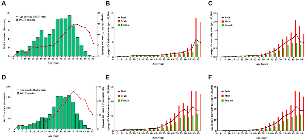 For HL, the DALY number was more than 5000 in the age groups 30–34 years and 40–74 years, and reached a peak in the age group of 65–69 years, whereas the age-specific DALY rate per 100,000 population was more than five in the age group of >45 years and reached a peak in the age group of 70–74 years (Figure 1A). The age-standardized DALY rate, ASIR, and ASMR per 100,000 population were 6.50 (95% UI, 4.61–8.58), 0.78 (95% UI, 0.50–0.98), and 0.20 (95% UI, 0.13–0.26), respectively, in men; and 3.44 (95% UI, 2.49–4.52), 0.40 (95% UI, 0.27–0.53), and 0.10 (95% UI, 0.07–0.13), respectively, in women. The age-specific incidence rates per 100,000 was more than one in the age group of >60 years, and reached a peak in the age group of 90–94 years in both sexes (Figure 1B). The age-specific mortality rates per 100,000 population was more than one in the age group of 80–89 years, and reached a peak in the age group of 85–89 years in both sexes (Figure 1C).