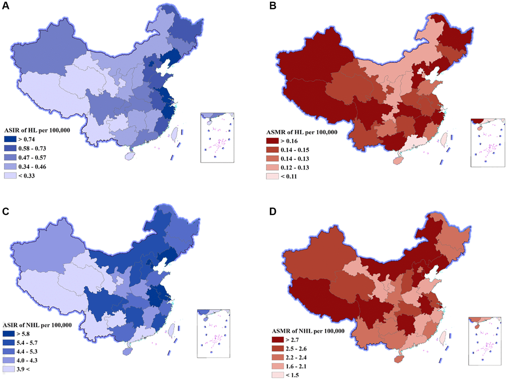 For NHL, the DALY number was the highest in Sichuan, Jiangsu, and Hunan, and the lowest in Macao special administrative region, Tibet, and Ningxia. The age-standardized DALY rate was the highest in Hunan, Tibet, and Liaoning, and the lowest in Macao special administrative region, Guangdong and Zhejiang (Supplementary Figure 1D). The ASIR was the highest in Shanghai, Tianjin, and Liaoning, and the lowest in Tibet, Yunnan, and Gansu (Figure 2C, Supplementary Figure 1E, Supplementary Table 3). The ASMR was the highest in Liaoning, Hunan, and Sichuan, and the lowest in Macao special administrative region, Guangdong, and Shandong (Figure 2D, Supplementary Figure 1F, Supplementary Table 3).