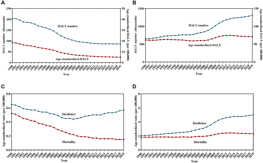 For HL, the DALY number and age-standardized DALY decreased by 57.8% and 74.4%, respectively, between 1990 and 2019 (Table 3, Figure 3A). The average annual percent change (AAPC) was −4.6 with 95% confidence interval (CI) of −4.8 to −4.4. The ASIR and ASMR showed a downward trend with a decrease of 12.3% (AAPC = −0.4, 95% CI: −0.6 to −0.2) and 71.2% (AAPC = −4.4, 95% CI: −4.5 to −4.2), respectively, over the past three decades (Figure 3C).