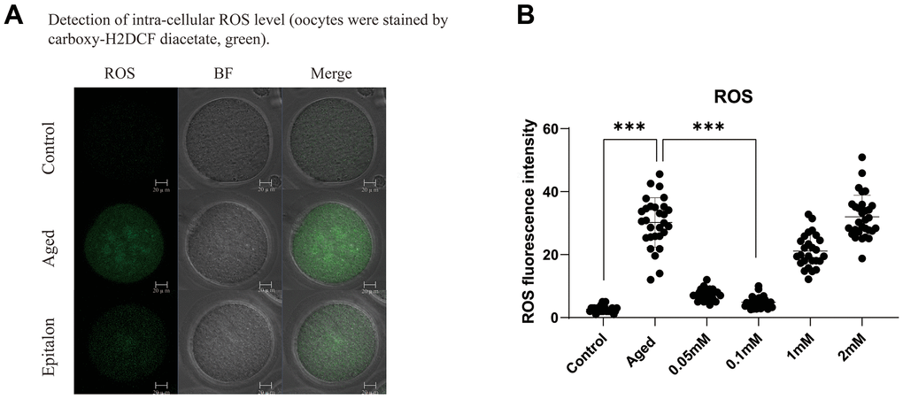 A previous study showed that the accumulation of intracellular ROS is an important manifestation of post-ovulatory oocyte aging. Moreover, ROS accumulation was more obvious after 24h in vitro culture, so we chose oocyte aging for 24 hours to detect the efficiency of Epitalon scavenging ROS in vitro. We first chose to add 0.05mM, 0.1 mM, 1 mM, or 2 mM Epitalon in M2 medium and analyzed the ROS contents in oocytes aging in vitro for 24 hours. We found that when the oocytes were exposed to 0.1mM Epitalon, the level of ROS was significantly reduced compared to the Aged group, while 1mM and 2mM Epitalon unexpectedly could not rescue the ROS accumulation in the aged oocytes (Figure 1). Based on the above analysis, we concluded that 0.1mM concentration of Epitalon could reduce ROS in aging oocytes.