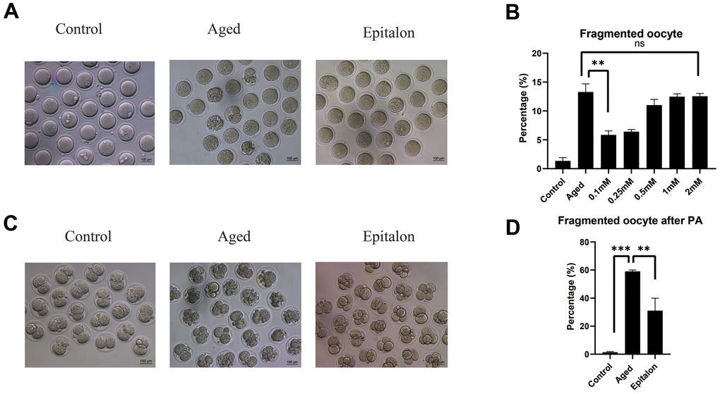 The most intuitive way to measure the quality of oocytes is to observe whether oocytes can maintain the integrity of the cytoplasm during aging. Firstly, we detected the morphology and integrity of oocytes aged 24 h in vitro after Epitalon supplementation and counted the incidence of fragmentation. As shown in Figure 2, most control fresh oocytes were normal in morphology. However, fragmentation occurred more frequently in the aged group (Figure 2A). To determine the protective effect of Epitalon on the integrity of aging oocytes, ovulated oocytes were cultured with increased dose of Epitalon (0.05, 0.1, 0.25, 0.5, 1, 2mM) for 24 h. Strikingly, 0.1mM Epitalon significantly reduced the fragmentation rate, from 13% in the aged group to 5.8% in the Epitalon supplement group (Figure 2B). We also measured the rate of oocyte fragmentation during parthenogenetic activation of aged oocytes in three groups. Results showed that the Epitalon group reduced the rate of cytoplasmic fragmentation in parthenogenetic activation by approximately 27.0% (Figure 2C, 2D). These results suggest that Epitalon can protect integrity of aged oocytes.