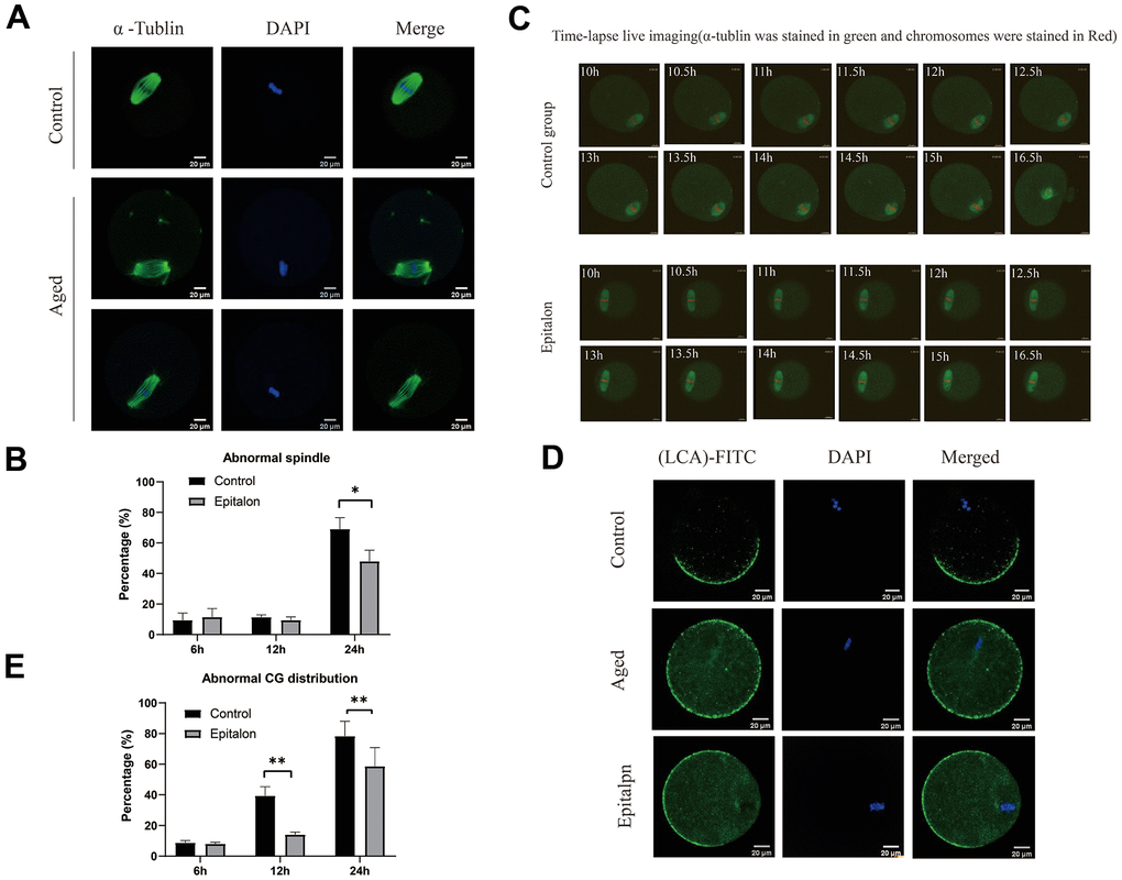 It is well known that aging of oocytes causes numerous morphological and cellular changes, including alterations and displacement of spindle structure, misalignment of chromosomes, displacement of first polar body and CGs, and premature exocytosis of CGs. In order to test whether Epitalon has a protective effect on spindle integrity in oocytes, we added 0.1mM Epitalon to the culture medium to observe spindle integrity at 6h, 12h, and 24h of culture. We found that the degree of spindle abnormalities was low before 12h, but increased significantly at 24h, and the spindle defects could be partially rescued by Epitalon (Figure 3A, 3B), suggesting that Epitalon can reduce oocyte spindle defects. The protective effect of Epitalon on spindle integrity was also confirmed by time-lapse live imaging (Figure 3C).