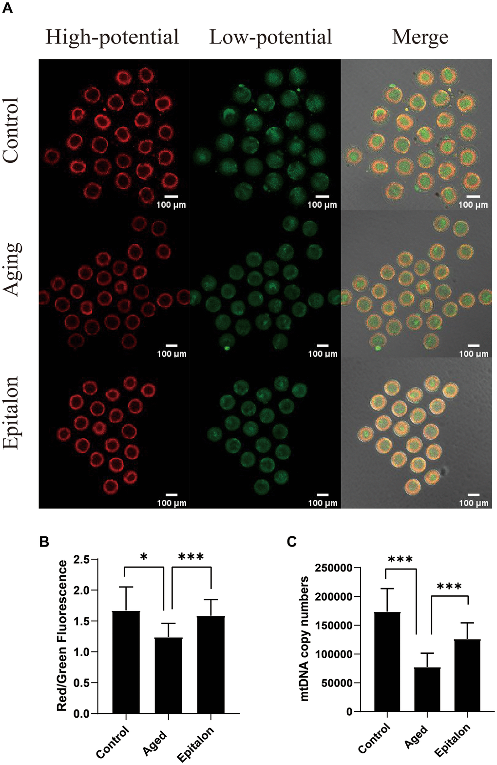 Normal mitochondrial membrane potential (MMP) is a prerequisite for mitochondria to carry out respiratory activity, which is necessary for the maintenance of mitochondrial function. In order to detect the effect of Epitalon on the membrane potential of aging oocytes, JC-1 was used to analyze the membrane potential, and the ratio of red/green fluorescence of oocytes was evaluated to reflect mitochondrial function in control, aging, and 0.1mM Epitalon groups. Confocal microscopy showed that active mitochondria were mainly distributed in the peripheral region while low-activity mitochondria were mainly distributed in the central region of the ooplasm (Figure 4A). Meanwhile, the oocyte groups treated with 0.1mM Epitalon showed a higher MMP at 24h of in vitro culture as compared to aging oocytes (Figure 4B). In addition, mtDNA copy number at 24h was markedly higher in Epitalon-treated oocytes than in oocytes without Epitalon treatment (Figure 4C), demonstrating that Epitalon has a positive effect on mitochondria to some extent.