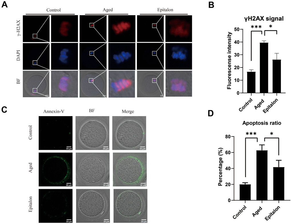 Since aging adversely increases oxidative stress and DNA damage, thus accelerating apoptosis of mouse oocytes, we assessed the degree of DNA damage in the aged group and the Epitalon treatment group. As shown (Figure 5A), the fluorescence intensity of γH2AX signals, an indicator of DNA damage, was considerably increased in aged oocytes in comparison with fresh controls. Notably, addition of Epitalon during aging culture was able to alleviate DNA damage (Figure 5B).