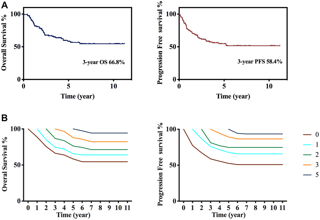 OS was calculated from the date of the diagnosis to the date of death from any cause or the last follow-up. PFS was calculated from the date of diagnosis to the date of disease progression, death from any cause or the last follow-up. Survival curves were created using the Kaplan–Meier method and were compared using the log-rank test. Cox regression was applied to analyze the prognostic factors affecting OS and PFS.