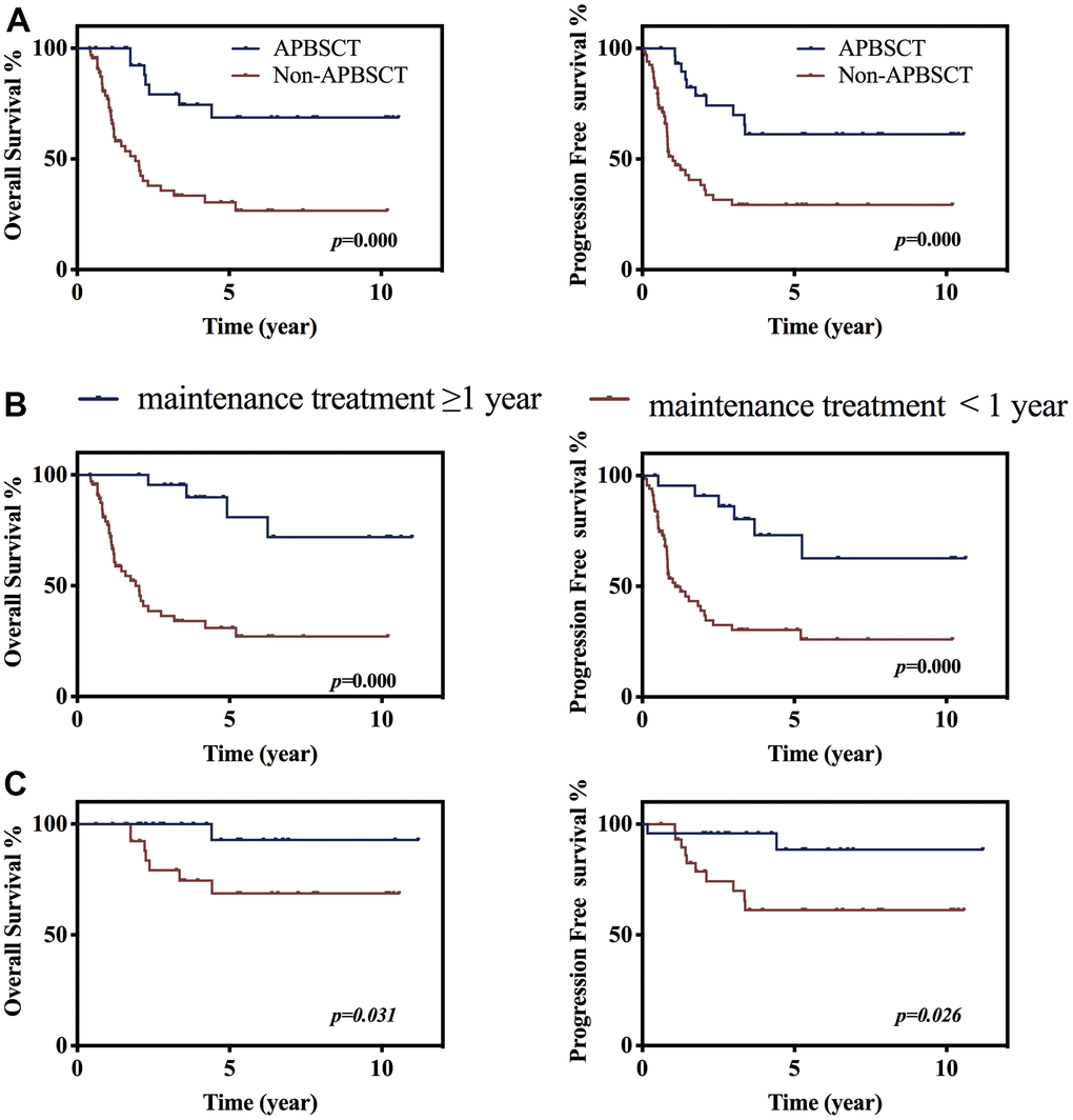 Maintenance treatment was suggested for patients, in our study, 48 patients had at least 1-year maintenance treatment. Maintenance treatment for ≥1 year for patients after dose-adjusted BFM-90 improved the prognosis significantly at 3 years compared with that for patients who did not have maintenance treatment for ≥1 year (OS, 80.9% vs. 36.3%; PFS, 79.8% vs. 30.3%, p < 0.001) (Figure 2B). Following ≥1-year maintenance treatment of patients who had APBSCT, produced better OS and PFS than patients without having maintenance treatment ≥1year after APBSCT therapy (OS, 92.9% vs. 79.1%; PFS, 88.5% vs. 69.9%, p < 0.05, Figure 2C). To clearly describe the value of APBSCT and maintenance treatment, we compare the OS and PFS of patients receiving either APBSCT or at least one-year maintenance treatment after BFM-90. While, no significant differences on survival were seen between patients having maintenance treatment ≥1 year and those having APBSCT after dose-adjusted BFM-90 treatment (Supplementary Figure 2B). Multiple-factor analysis also showed that APBSCT and maintenance treatment were independent protective factors for OS and PFS (Supplementary Table 1).