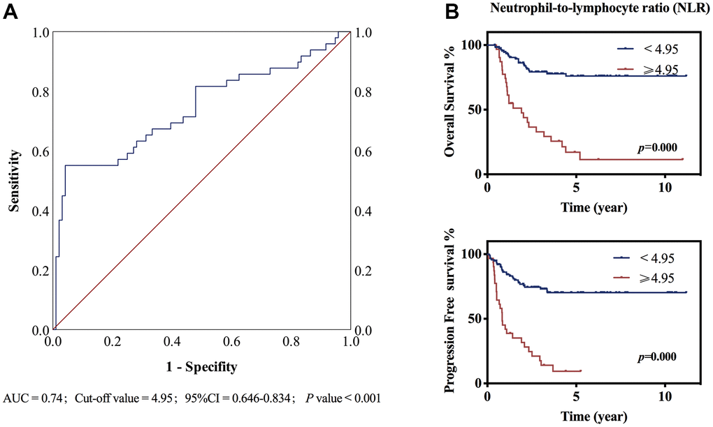 Prognostic analysis of patients’ characteristics showed that IPI was a significant marker predicting prognosis of T-LBL patients receiving dose-adjusted BFM-90. Individuals with IPI of 0–1had better OS and PFS than those of 2–4 (3-year OS 84.1% vs. 56.1%; 3-year PFS 71.7% vs. 49.2 %, p < 0.01). CNS or BM involvement was adverse factors causing inferior OS and PFS (p<0.001). (Table 1) In addition to these traditional factors, immune cell parameters were reported with significant prediction function for survival [17]. However, there was no definition of the cut-off value for NLR, ranging from 2 to 7 in most studies [18–22]. In our study, we used OS as the endpoint of interest and ROC analysis was performed to calculate the optimal cut-off value for NLR. The area under the ROC curve (AUC) for NLR was 0.74, and the optimal cut-off values corresponding to the maximum joint sensitivity and specificity were 4.95 (p<0.001) (Figure 3A). Patients with NLR ≥4.95 had poor OS and PFS (p<0.001). (Figure 3B) Univariate and multivariate analysis also presented that NLR ≥4.95 was an independent risk factor for patients’ OS and PFS with hazard ratio at 2.39 (95% CI 1.55-4.89, p=0.015) and 2.07 (95% CI 1.25-4.96, p=0.021) respectively (Supplementary Table 1).