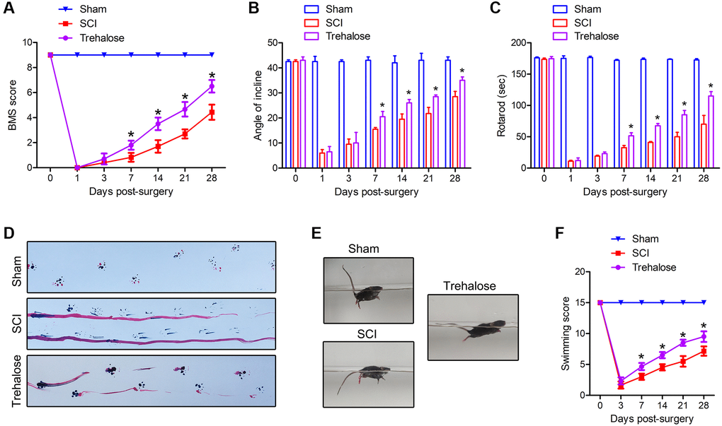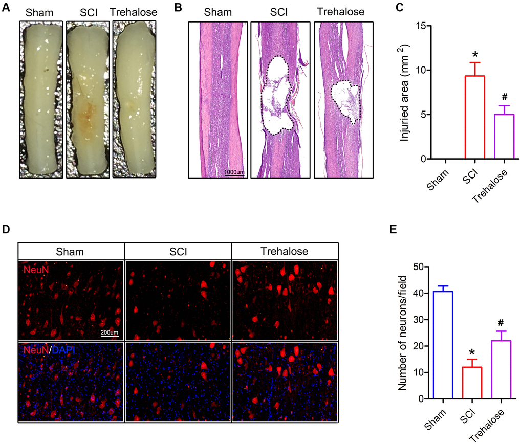 The mice were first anaesthetized by intraperitoneal injection of 2% pentobarbital, before fully exposing the spinous process and lamina of the T10 segment. After fully exposing the spinal cord, a striker rod with a chosen weight of 10 g and a height of 2.5 mm was released to fall freely for spinal cord percussion modelling. Hemorrhage and swelling of the spinal cord in the striking segment can be seen immediately after the blow. The criterion for evaluating the success of the SCI model is: after modeling, twitching of the lower limbs of the mouse is first seen, which in turn leads to loss of muscle strength and paralysis. The wound was rinsed with saline and sutured layer by layer. After modeling, the mice were made to urinate artificially everyday, once a day, until their autonomous urination function was restored. Trehalose (Sigma) was prepared as a 2% w/v solution in a standard suspension vehicle (SSV; 0.9% NaCl, 0.5% Na-carboxy-methylcellulose, 0.5% benzyl alcohol and 0.4% Tween 80). The animals were given 0.1 ml/10 g body weight by gavage daily for three days.