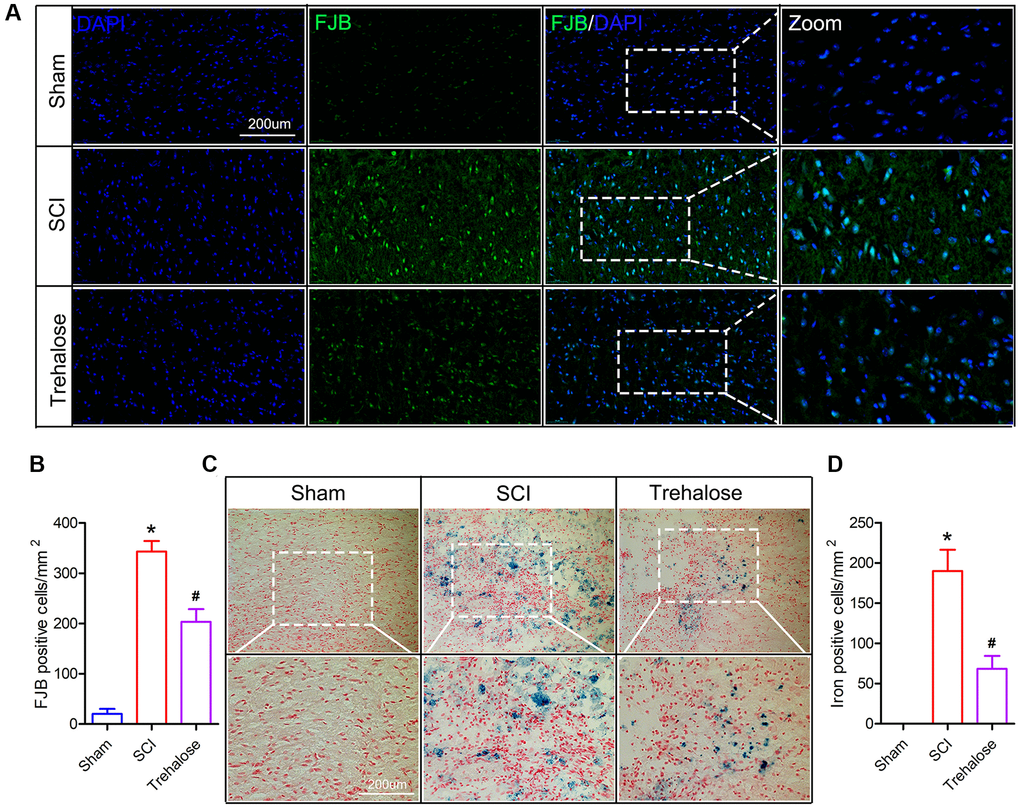FJB staining is a specific staining for degeneration and necrosis of neurons. It is used to compare the degeneration and necrosis of neurons in each group on the 3rd day after SCI. The FJB staining results showed that on the third day after surgery, the FJB positive cells in the spinal cord tissue of the SCI group were significantly increased compared to that in the sham group; and compared to the SCI group, the FJB positive cells in the spinal cord tissue of the trehalose group decreased (Figure 3A, 3B). In addition, we found that on day 3 after SCI, the number of iron-positive cells in the SCI group increased significantly, while compared to the SCI group, the iron-positive cells in the spinal cord tissue of the trehalose group decreased (Figure 3C, 3D).