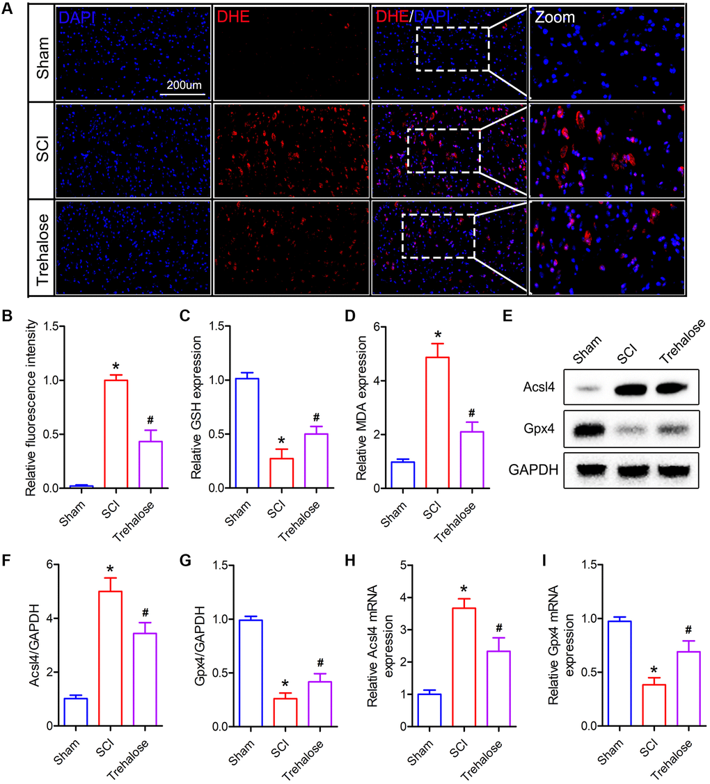 Furthermore, we studied the effect of trehalose on ferroptosis-related indicators after SCI. Firstly, we used DHE staining to detect the production of ROS after SCI. The results showed that ROS increased after SCI, while the fluorescence intensity of ROS decreased significantly after treatment with trehalose (Figure 4A, 4B). In addition, the results of lipid peroxide measurement showed that the MDA content in the spinal cord tissue of the SCI group was significantly higher than that in the sham group on the third day after the operation (Figure 4D). After the trehalose intervention, it significantly reduced the level of MDA in the spinal cord of mice with SCI. In addition, the experimental results also showed that the GSH content in the spinal cord tissue of the SCI group was significantly lower than that in the sham group on the third postoperative day, but compared with the SCI group, the GSH content in the spinal cord tissue of the trehalose group was significantly improved (Figure 4C). Then, we used Western blot to measure ferroptosis-related proteins and found that trehalose treatment can inhibit the decrease of Gpx4 protein and the increase of Acsl4 protein (Figure 4E–4G). PCR further confirmed the Western blot results (Figure 4H, 4I). In summary, the above results prove that trehalose can inhibit ROS production and ferroptosis caused by lipid peroxides after SCI and reduce neuronal cell degeneration and iron accumulation.