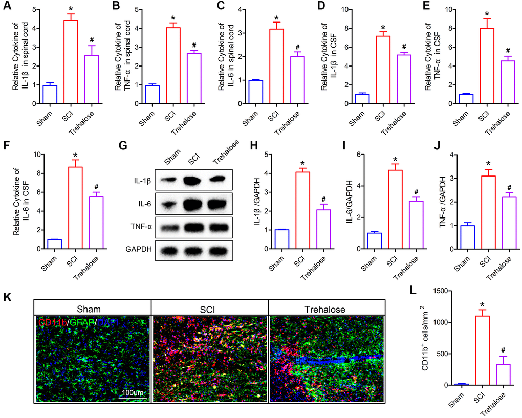 Studies have shown that ferroptosis is closely related to inflammation, and the process of ferroptosis is often accompanied by inflammation, which is called ferroptosis-related inflammation [27]. Therefore, we further studied the effect of trehalose on the inflammatory response after SCI. Firstly, we used the ELISA test to detect pro-inflammatory cytokines in spinal cord tissue and cerebrospinal fluid (CSF). The results showed that 3 days after SCI, IL-1β, IL-6 and TNF-α in both CSF and spinal cord tissue were significantly higher than those in the sham group (Figure 5A–5F). After treatment with trehalose, the levels of IL-1β, IL-6 and TNF-α decreased (Figure 5A–5F). Similarly, Western blot results also confirmed that trehalose treatment can reduce the expression of IL-1β, IL-6 and TNF-α after SCI (Figure 5G–5J). In addition, we used immunofluorescence staining of the microglia marker CD11b to study the effect of trehalose on the activation of microglia. The results showed that compared with the SCI group, the incidence of CD11b positive cells in the trehalose treatment group was significantly reduced (Figure 5K, 5L). In summary, the above results indicate that trehalose can inhibit the neuroinflammatory response after SCI.