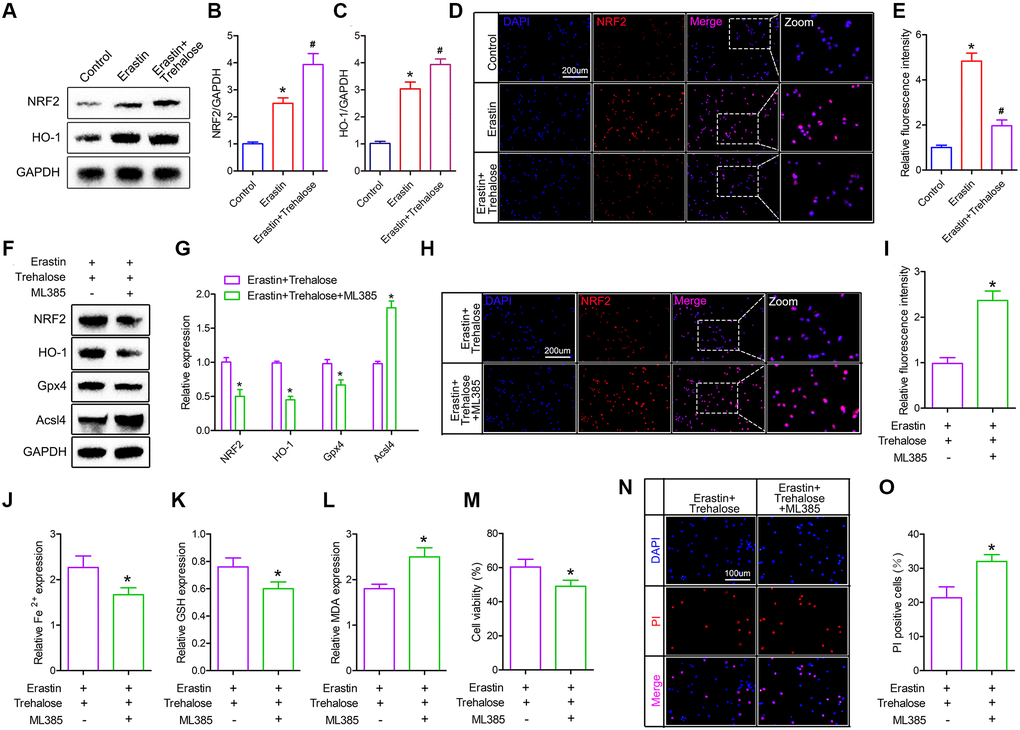 The NRF2 signaling pathway is a direct downstream pathway of ROS, which regulates the transcription of ARE-dependent genes to balance oxidative mediators and maintain cell redox homeostasis. Therefore, we investigated whether the NRF2/HO-1 pathway plays a key role in the inhibitory effect of trehalose on ferroptosis. First, we tested the changes of NRF2 and HO-1 proteins and found that their expression was increased after Erastin treatment, and the high expression of NRF2 and HO-1 proteins was further noticed after trehalose pretreatment (Figure 7A–7C). In addition, immunofluorescence staining of NRF2 also confirmed that trehalose pretreatment promoted the high expression of NRF2 protein (Figure 7D, 7E). To further verify that trehalose inhibits Erastin-induced ferroptosis by activating the NRF2 pathway, we pretreated neuronal cells with trehalose (100 μM, 24 h) and NRF2 pathway inhibitor ML385 (5 μM, 24 h), and then stimulated neuronal cells with Erastin (5 uM, 12 h) to explore whether inhibition of NRF2 pathway could weaken trehalose-ferroptosis suppression effect. Western blot results showed that ML385 significantly down-regulated the high expression of NRF2 protein induced by trehalose, and also inhibited the protein expression of the downstream target gene HO-1 of NRF2 (Figure 7F, 7G). The immunofluorescence staining of NRF2 also further confirmed that ML385 inhibited the high expression of NRF2 protein induced by trehalose (Figure 7H, 7I). In addition, ML385 can inhibit the increase in Gpx4 expression and the decrease in Acsl4 expression induced by trehalose (Figure 7F, 7G). At the same time, ML385 can significantly reduce the high-level GSH content induced by trehalose and increase the intracellular Fe2+ content and MDA level (Figure 7J–7L). The results from CCK8 and PI staining also confirmed that ML385 reversed the increase in cell viability promoted by trehalose (Figure 7M–7O). In summary, these results indicate that the NRF2/HO-1 pathway is involved in the inhibitory effect of trehalose on ferroptosis.