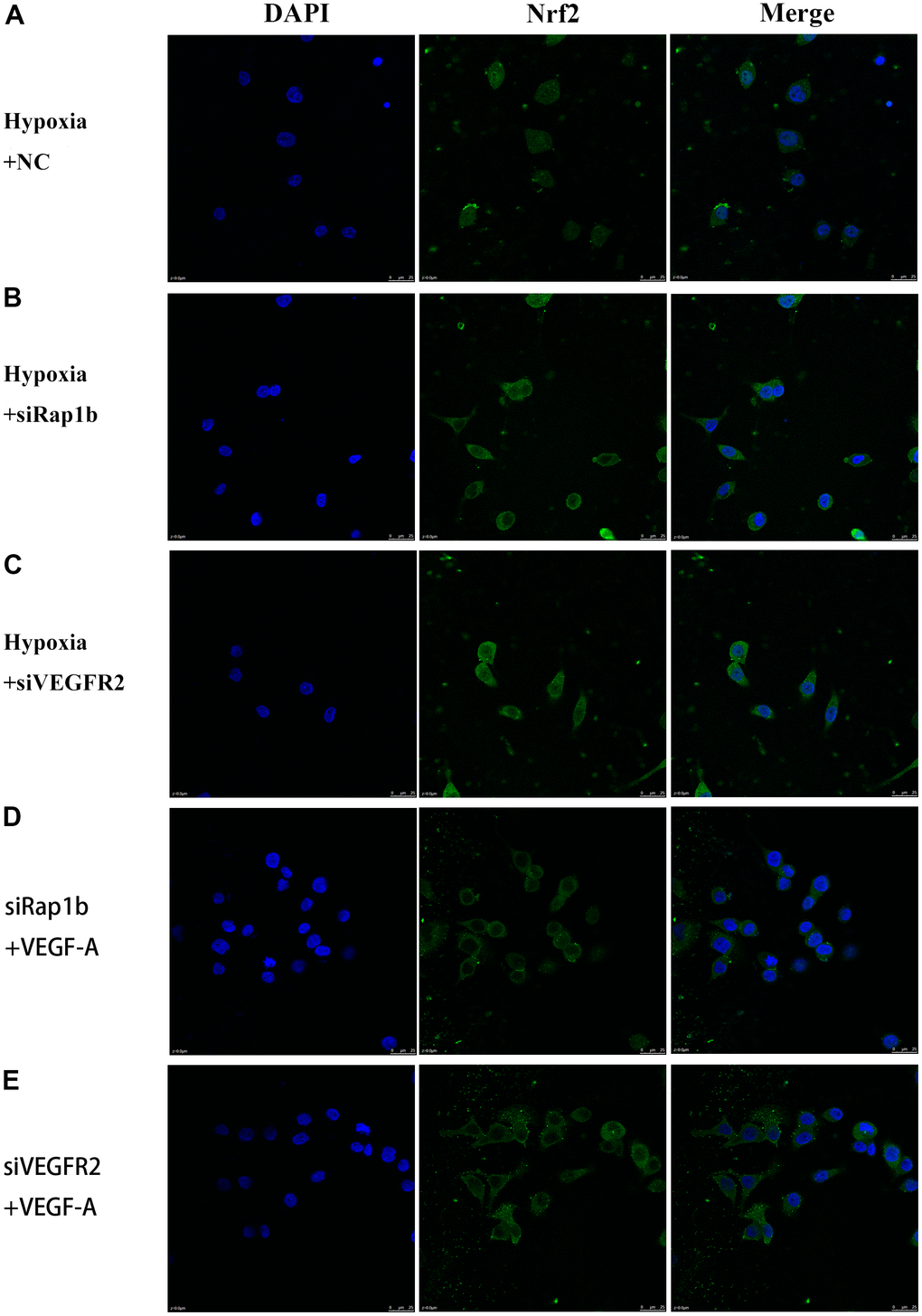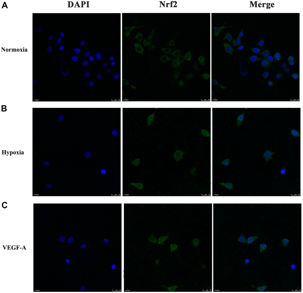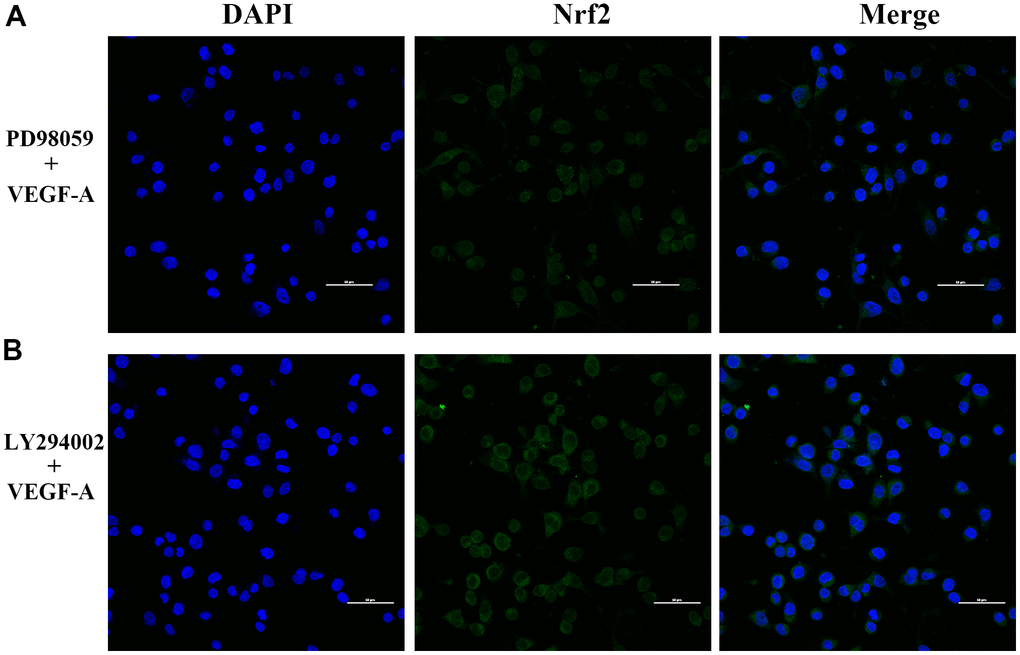 We further verified the possible regulatory relationship between Rap1b and Nrf2 and the impact of hypoxia on the nuclear translocation of Nrf2 in BGC823 cells under normoxia. Nrf2 was found to be located in the cytoplasm under normoxia (Figure 7A) and in the nucleus under hypoxia (Figure 7B). VEGF-A enhanced nuclear translocation of Nrf2 (Figure 7C). In the negative control group under hypoxia conditions, Nrf2 was located in the nucleus (Figure 8A); however, in the siRap1b (Figure 8B) and siVEGFR2 (Tables 6, 7 and Figures 9A, 8C) groups, there was no Nrf2 entering the nucleus. Under normoxic conditions, silencing Rap1b and VEGFR2, VEGF-A was used to stimulate BGC823 but Nrf2 did not shift to the nucleus (Figure 8D, 8E). This suggested that Rap1b and VEGFR2 could participate in Nrf2’s nuclear translocation. In addition, after siRap1b and siVEGFR2 were silenced, the expression of P-Erk1/2 (Thr202/Thr204) and P-Akt (Thr308) was decreased under hypoxia and VEGF-A induction conditions (Figure 9C). Erk1/2 inhibitor (PD98059) and Akt inhibitor (LY294002) suppressed the nuclear translocation of Nrf2 by VEGF-A (Figure 10). Furthermore, hypoxia promoted the expression of VEGF-A in GC cells (Table 6 and Figure 9B). These results revealed that the hypoxia/VEGF-A-Rap1b/VEGFR2 pathway aided in Nrf2 nuclear translocation and that Erk and Akt signaling cascades were also implicated in Nrf2 nuclear translocation (Figure 11).