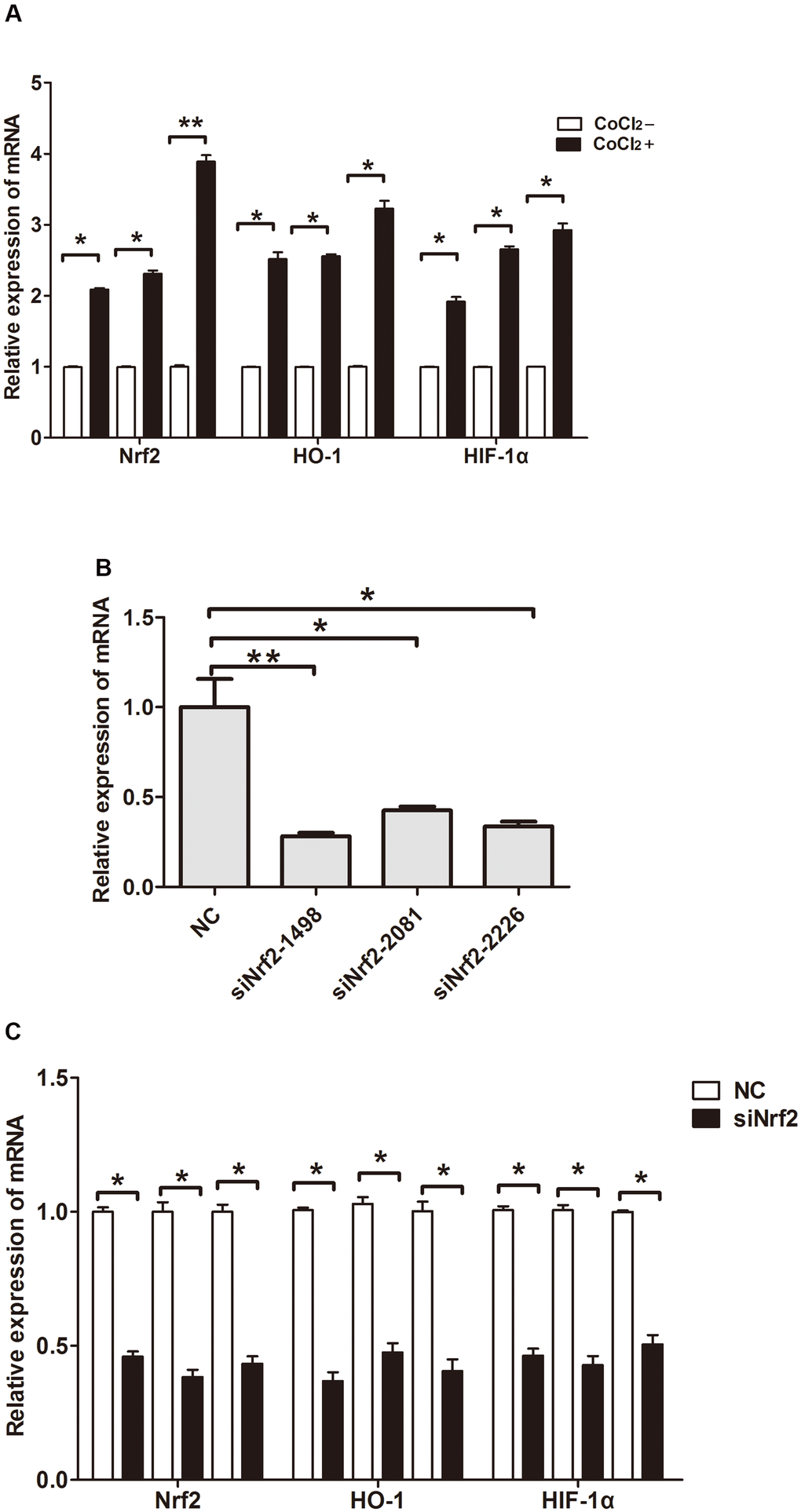 To clarify the function of Nrf2 in GC cells, we found that siNrf2-1498 was the most effective sequence (Table 7 and Figure 3B). Therefore, we used a negative control and siNrf2-1498 to transfect GC cells, processed the cells with 150 or 200 μM CoCl2 for 24 h, and then conducted the transwell invasion experiment. Under hypoxic conditions, the invasive potential of MKN28, BGC823, as well as SGC7901 cell transfects of siNrf2-1498 was reduced remarkably (P<0.05, Figure 5). Silencing of Nrf2 expression repressed HO-1 and HIF-1α expression in hypoxic conditions (P<0.05, Figures 3C, 4B). Therefore, Nrf2 facilitates the infiltration potential of GC cells in a hypoxic environment.