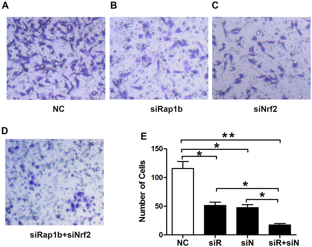 Rap1b and Nrf2 can promote the invasion and metastasis of GC. Whether the two have a synergistic effect on the progression of GC remains unclear. To confirm the correlation between Rap1b and Nrf2, Spearman’s analysis showed that the two were positively correlated (r = 0.581, P<0.001, Table 8). Univariate survival assessment exhibited that in contrast with patients from other groups, patients in the Nrf2 (+) Rap1b (+) group had the worst survival (OS 26.58 ± 1.30, 95% CI 24.02-29.14) (Table 9 and Figure 2C). Rap1b and Nrf2 can be used as joint markers to assess the prognosis of GC patients. Furthermore, the silencing of Rap1b and Nrf2 remarkably repressed the tumor cell infiltration capacity in the common group in contrast with the other groups, especially in the negative control group (Figure 6).