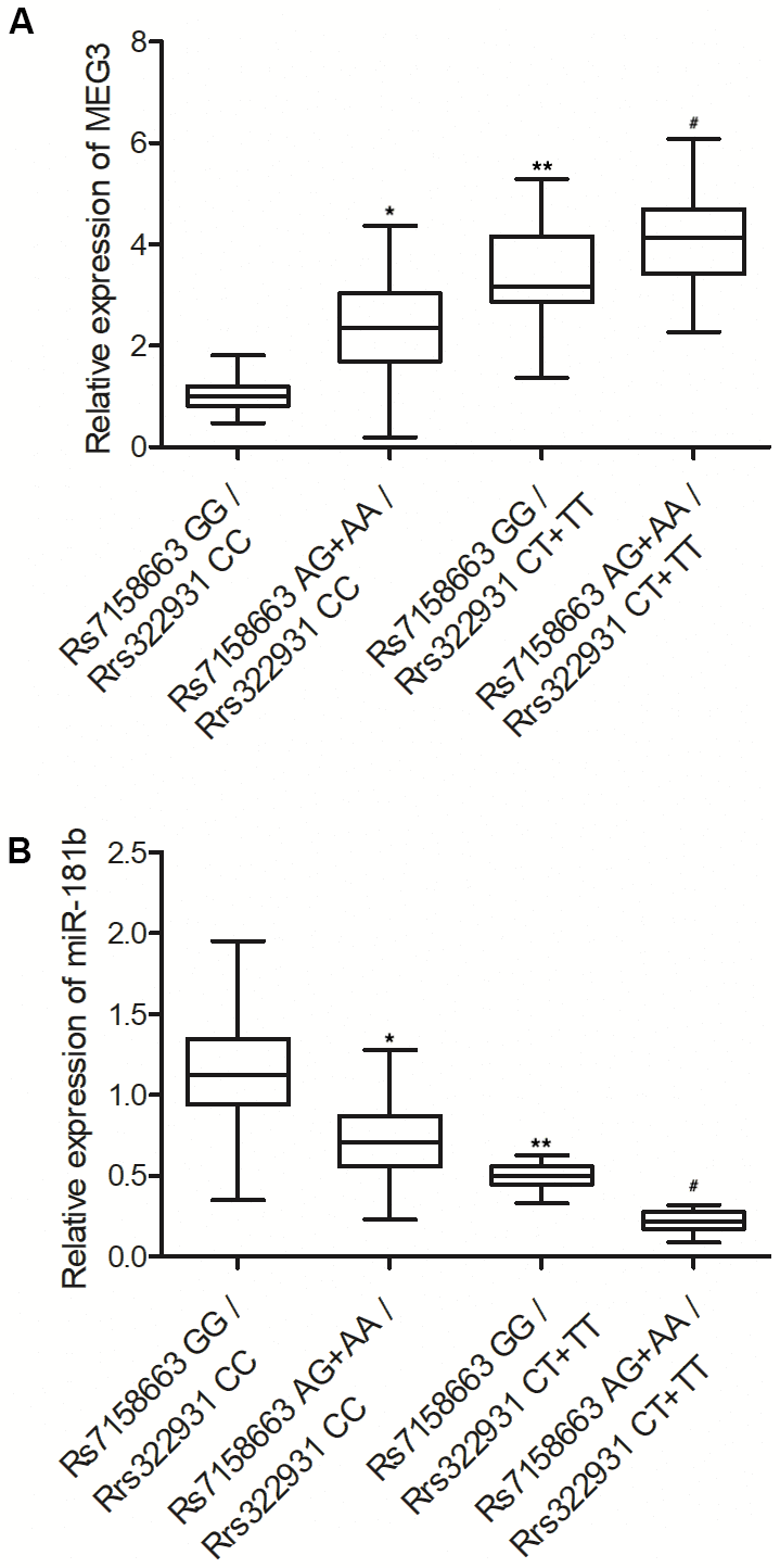 In order to compare the different expression of MEG3 and miR-181b in the peripheral blood collected from patients carrying different genotypes, qPCR was performed to analyze the gene expression of MEG3 and miR-181b in the peripheral blood samples. Obviously, the expression of MEG3 was progressively elevated in the peripheral blood from patients with rs7158663 GG/rs322931 CC, rs7158663 AG+AA/rs322931 CC, rs7158663 GG/rs322931 CT+TT, and rs7158663 AG+AA/rs322931 CT+TT (Figure 1A), whereas the expression of miR-181b showed the opposite trend in the four groups (Figure 1B). These results indicated that rs7158663 GG and rs322931 CC were negatively correlated with the expression of MEG3 but positively correlated with the expression of miR-181b in the peripheral blood of patients with Crohn’s disease.