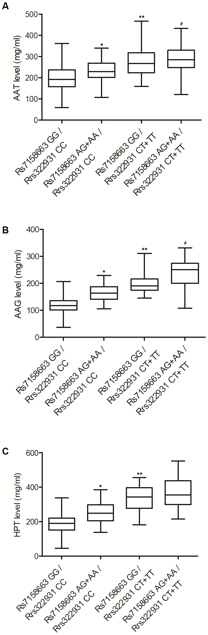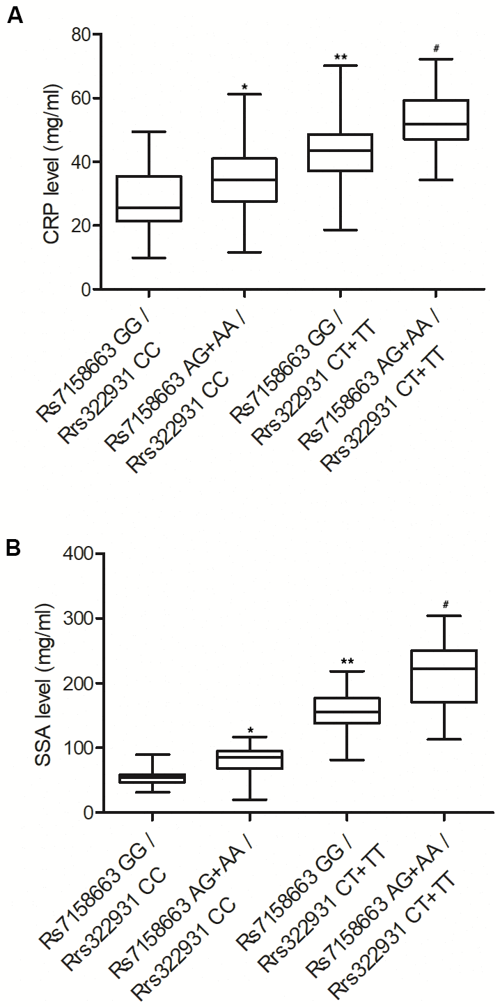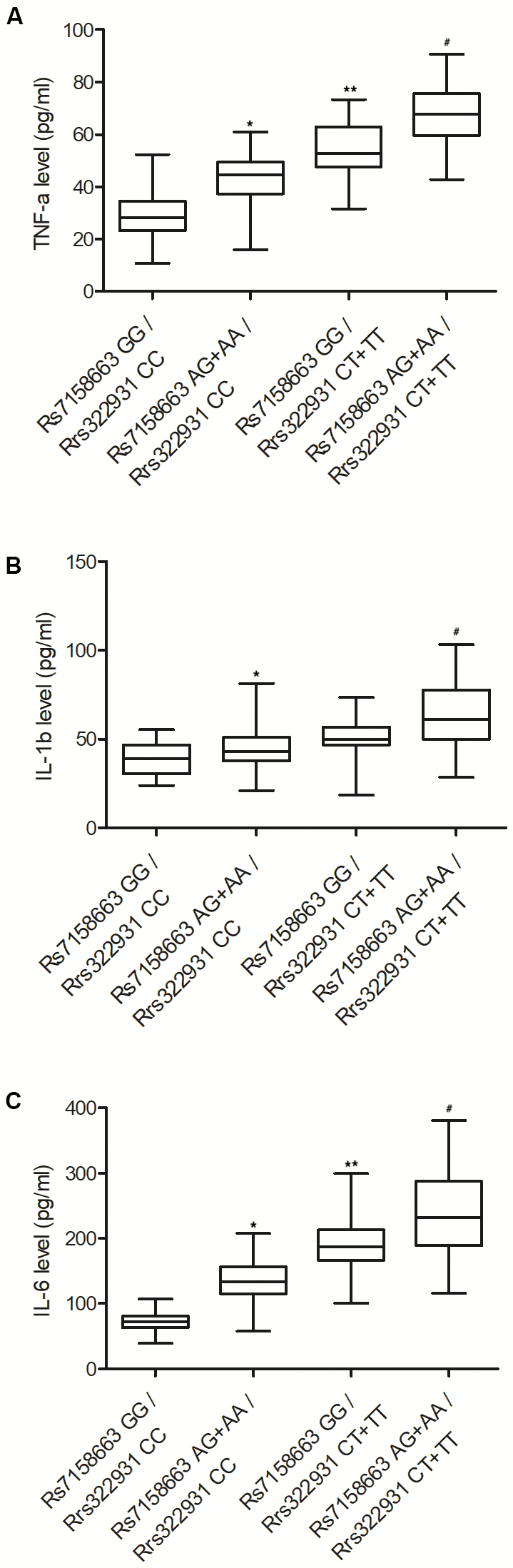 The TNF cytokine exerts a great impact on many biological processes. For example, low yet persistent TNF expression was revealed to induce rheumatoid arthritis as well as inflammatory bowel diseases (IBDs). Thus, TNF inhibitors may be a good candidate for patients who have failed first-line therapies [33]. A past study once showed that miR-124 expression was low in AA patients, along with substantially increased levels of IFN-γ, TNF-α, and IL-4. For that reason, the expression levels of miR-124 as well as related inflammatory factors may be used as biomarkers of AA. In this study, we performed ELISA to analyze the expression of TNF-α, IL-1β, IL-6, CRP, SSA, AAT, AAG and HPT in the peripheral blood of patients carrying different genotypes at rs7158663 and rs322931. The expression of TNF-α, IL-1β, IL-6, CRP, SSA, AAT, AAG and HPT was progressively elevated in the peripheral blood from patients carrying rs7158663 GG/rs322931 CC, rs7158663 AG+AA/rs322931 CC, rs7158663 GG/rs322931 CT+TT, and rs7158663 AG+AA/rs322931 CT+TT genotypes.