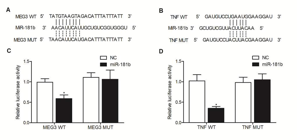 MiR-181b suppressed the expression of MEG3 and TNF-α through binding to their 3’ UTR