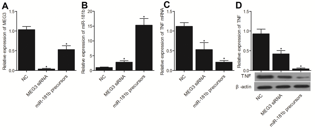 MEG3 siRNA and miR-181b precursors suppressed the expression of MEG3 and TNF-α but activated the expression of miR-181b