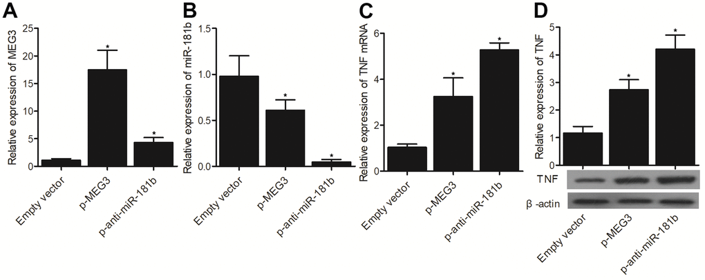 P-MEG3 and p-anti-miR-181b enhanced the expression of MEG3 and TNF-α but inhibited the expression of miR-181b