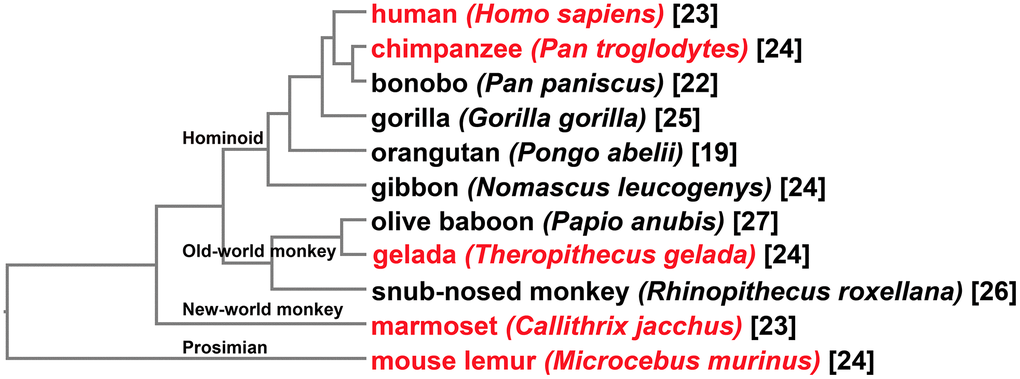 Genome sequences, coding sequences, peptides and GFF files were obtained from Ensembl for human (Homo sapiens), chimpanzee (Pan troglodytes), gelada (Theropithecus gelada), orangutan (Pongo abelii), olive baboon (Papio anubis), bonobo (Pan paniscus), gibbon (Nomascus leucogenys), mouse lemur (Microcebus murinus), gorilla (Gorilla gorilla) and marmoset (Callithrix jacchus) [53]. Genome files of golden snub-nosed monkey (Rhinopithecus roxellana) were downloaded from NCBI Genome Browser [54]. Evolutionary relationships of the above species were retrieved from TimeTree [55].