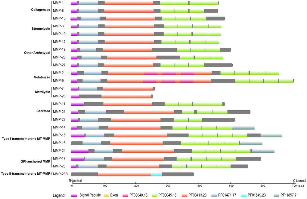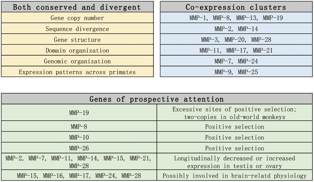 In conclusion, we carried out genome-enabled identification and characterization of putative MMPs across 11 primate organisms from the perspectives of phylogeny, domain organization, gene structure, genome organization and gene expression, and we identified MMPs which need attentions in future studies (As summarized in Figure 10). Our results shed new light on the classification of MMP family, and our findings can illuminate the discovery of prognostic biomarkers and therapeutic targets for aging-related diseases. [29, 47, 48].