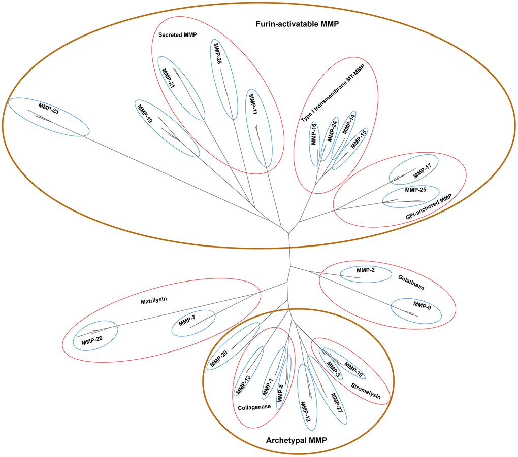 Based on biochemical properties, MMPs can be classified into four groups, namely archetypal MMPs, matrilysins, gelatinases, and furin-activatable MMPs (Table 1) [24]. Our phylogenetic topology shows that MMPs are clustered in four major groups (shown in brown circles in Figure 2). MMP-1s, MMP-8s and MMP-13s are proximate to each other, which biochemically serve as collagenases; MMP-3 and MMP-10, two clades as stromelysins, form an independent group. These peptides, together with MMP-12s and MMP-27s, are clustered together, which can be biochemically classified as archetypal MMPs. MMP-11s, MMP-21s and MMP-28s, three secreted MMPs, are proximate to each other. MMP-14s, MMP-15s, MMP-16s and MMP-24s, which are type-I transmembrane MT-MMPs, form a group. MMP-17 and MMP-25, GPI-anchored MMPs, clustered together. These peptides, together with MMP-19 and MMP-23, form a group and can be classified as furin-activatable MMPs, except MMP-19 which is referred to as an archetypal MMP-. MMP-7s and MMP-26s serve as matrilysins, and MMP-2s and MMP-9s serve as gelatinases, and they form a group, respectively. In summary, the phylogenetic topology of primate MMPs largely agrees with biochemistry-based classification, which demonstrates the power of phylogenetic analysis as a guide in biochemical characterization of a certain MMP gene.
