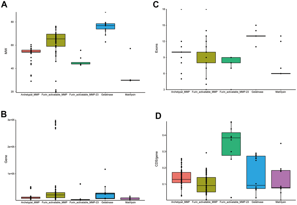 Peptide molecular weights were calculated by using Bachem’s Peptide Calculator (https://www.bachem.com/knowledge-center/peptide-calculator/). Gene structure information was retrieved from GFF3 files. Gene length was calculated from the start to the end point of each gene, and CDS length was calculated by deducting intron lengths from gene length. While MMP-23s are classified in furin-activatable MMPs, they demonstrate very different characteristics than other MMPs, and thus were investigated separately.