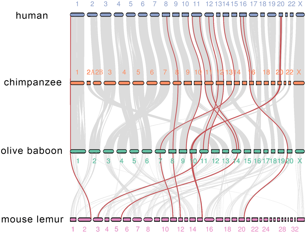 We then investigated co-synteny of the primate genomes and the MMPs in the co-synteny clusters. We compared the human genome with the genomes of three other primates, chimpanzee, a Hominoid, olive baboon, an old-world monkey, and mouse lemur, a Prosimian species. The genome of marmoset, the only new-world monkey representative, was not assembled to the chromosome level, and thus was excluded from the co-synteny analysis [28]. There was high co-synteny between the human and chimpanzee genomes, and between chimpanzee and olive baboon genomes. There was moderate co-synteny between the olive baboon and mouse lemur genomes. Twenty-one of 23 human genes are located in 12 co-synteny clusters. A cluster in the human 16th chromosome, where MMP-2 and -15 are located, is not shared between chimpanzee and olive baboon. Only 16 MMPs are within the 8 co-synteny clusters between olive baboon and mouse lemur. The co-synteny cluster in the human 11th chromosome, where the 9-gene cluster is located, is conserved across all the four primate species (Figure 7). Together, these results demonstrate that both conservation and divergence of MMPs are attributable to the conserved genome organization over primates and changes of co-synteny as the genetic relationship gets further.
